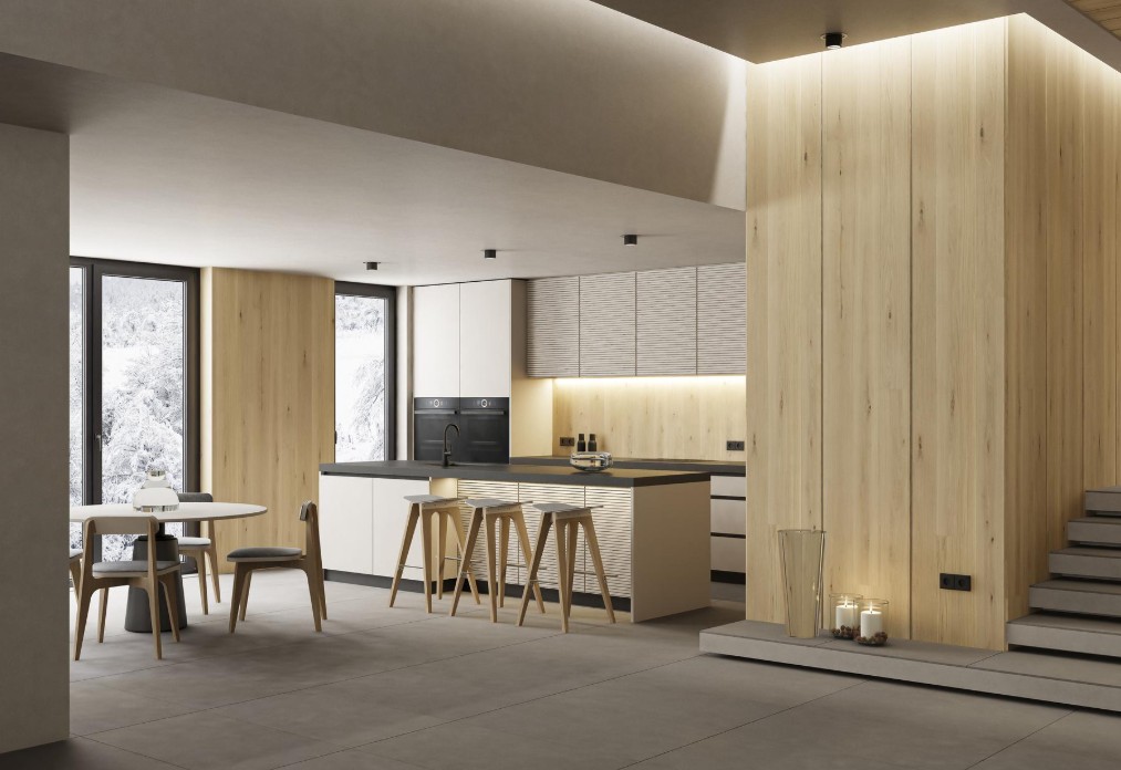 Мебель выбирают лаконичную, с простыми линиями и без декоративной вычурности. Дерево используется преимущественно в теплых тонах — дуб, ясень, орех. Камень добавляет глубины и текстуры.
