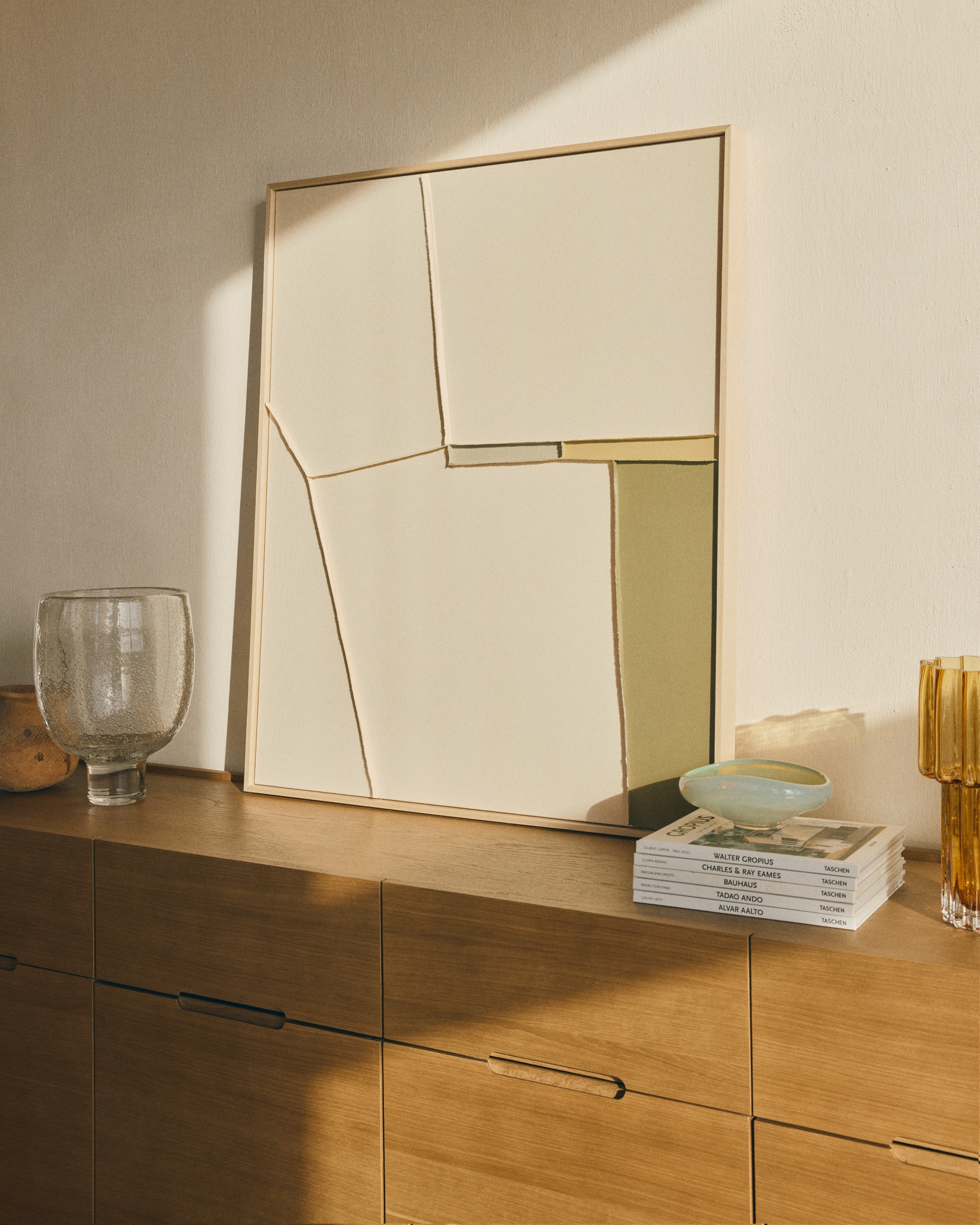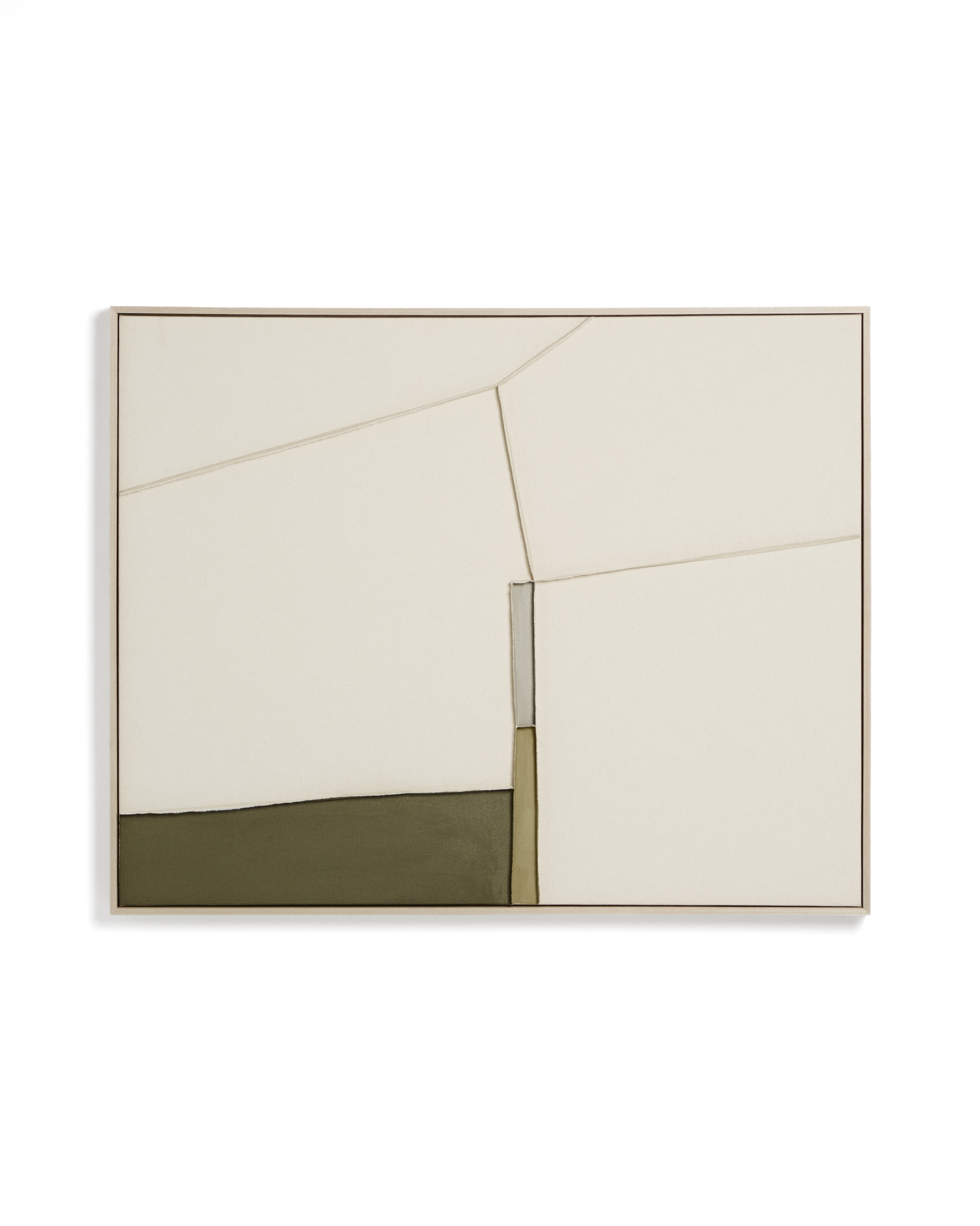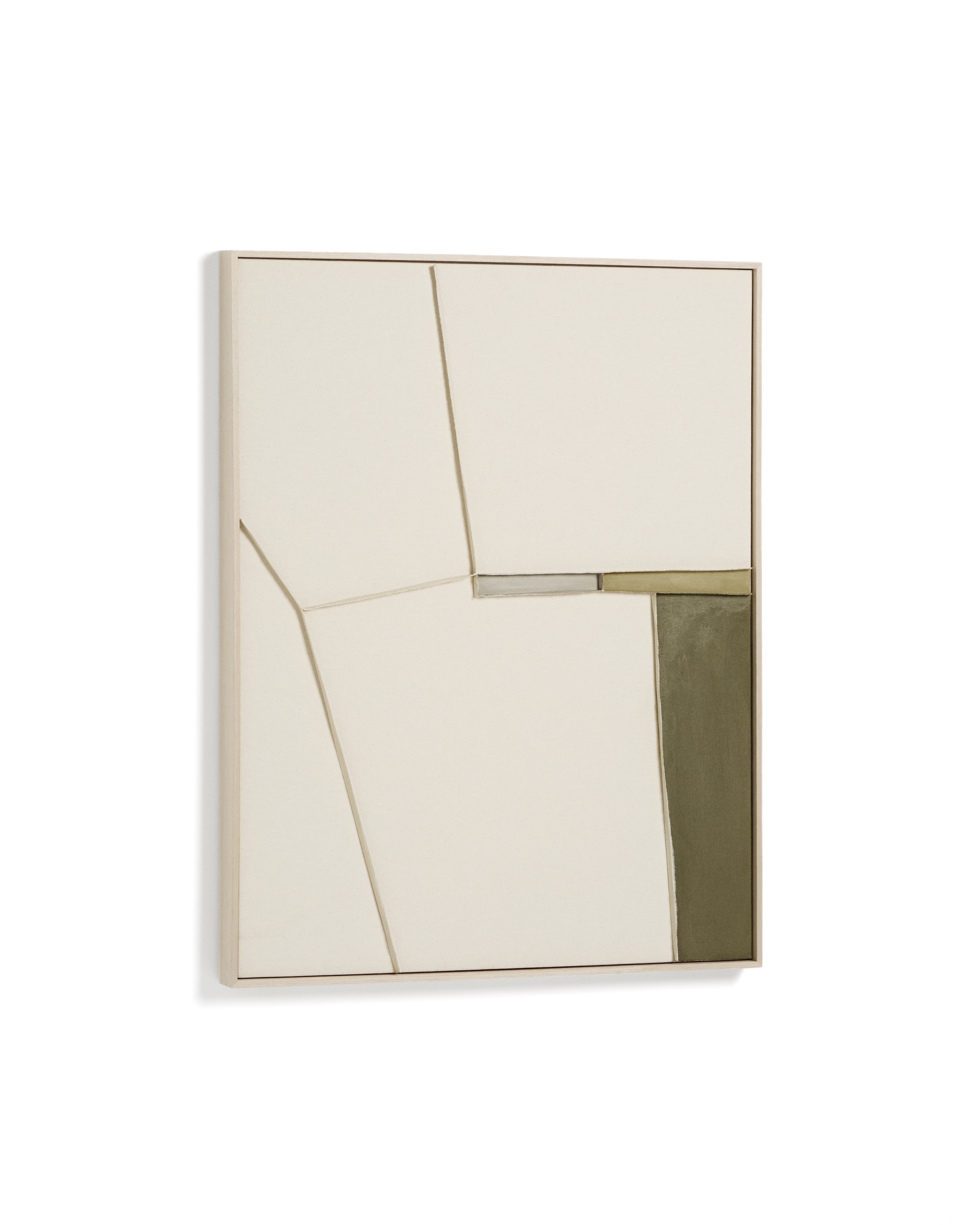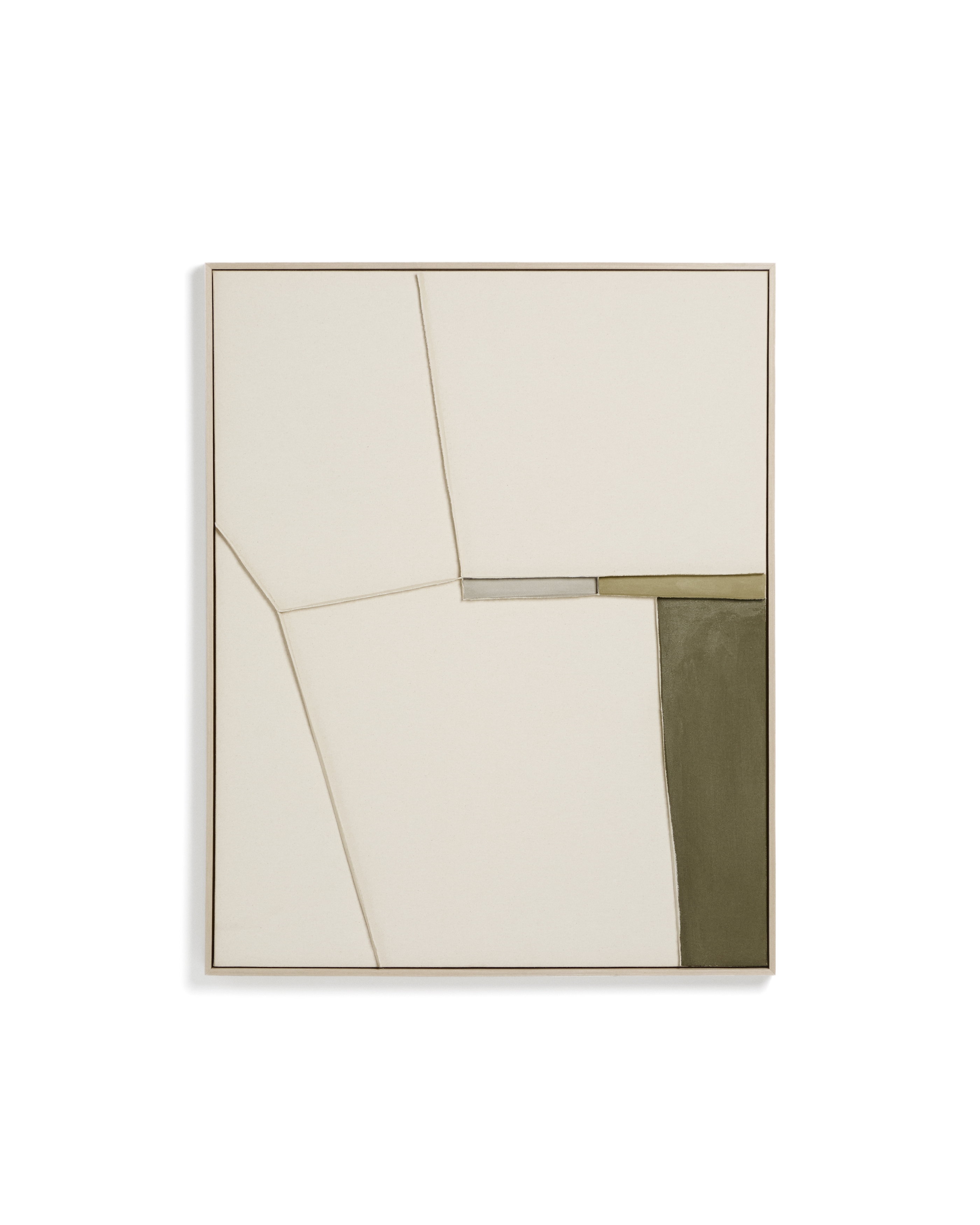 Коллекция Deravia представляет собой абстрактные картины, в которых рельефы, выполненные в технике льняной вышивки, сочетаются с палитрой мягких зеленых и нейтральных тонов, которые вводят цветовые нюансы, не нарушая баланса всей композиции, и привносят в пространство ощущение спокойствия. Каждая картина поставляется в раме с D-образным креплением, подходящим для любого типа стены.