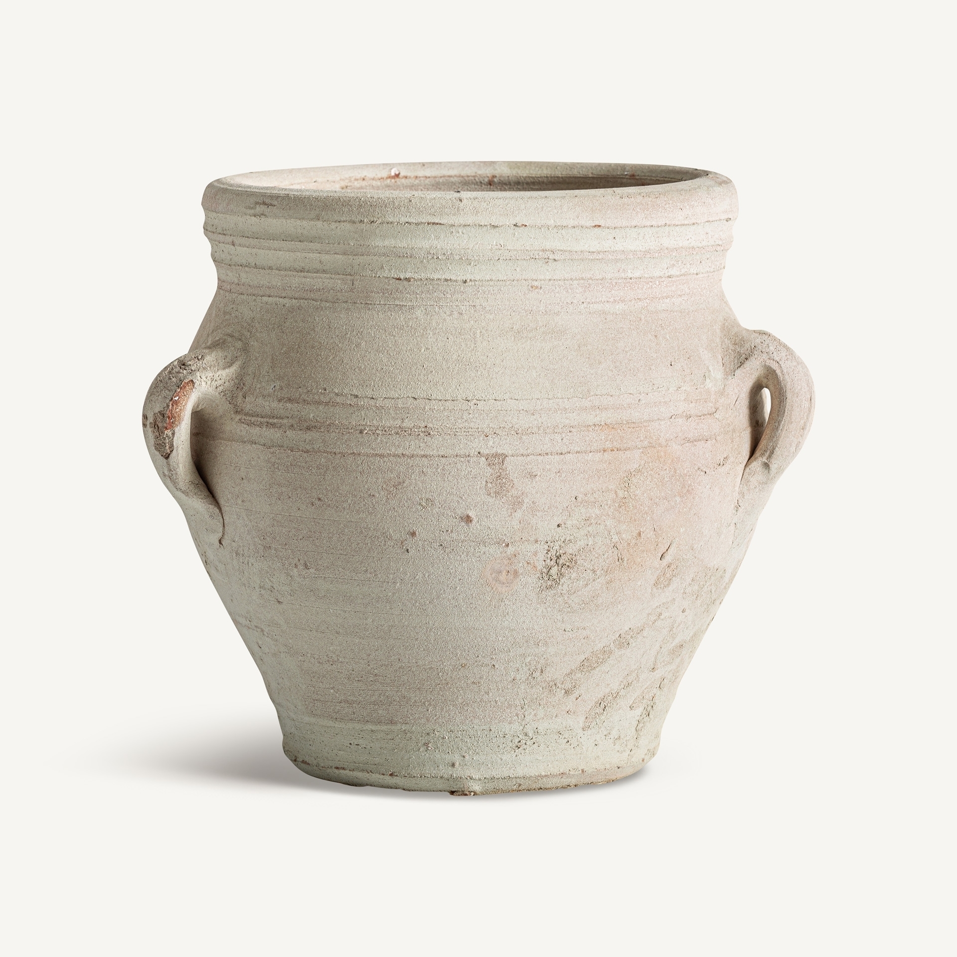 Амфора в классическом стиле, изготовленная из глины не совсем белого цвета с состаренной отделкой.