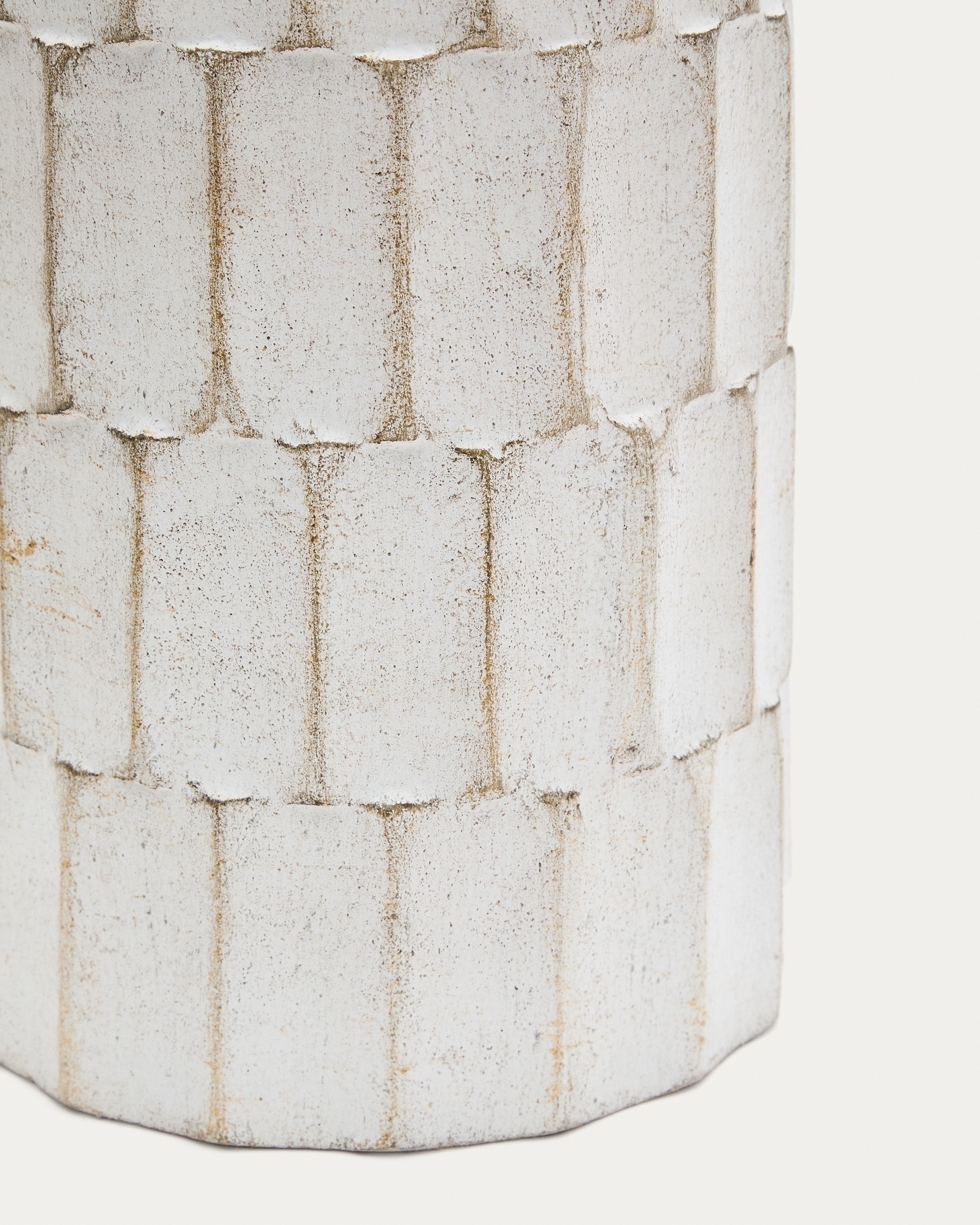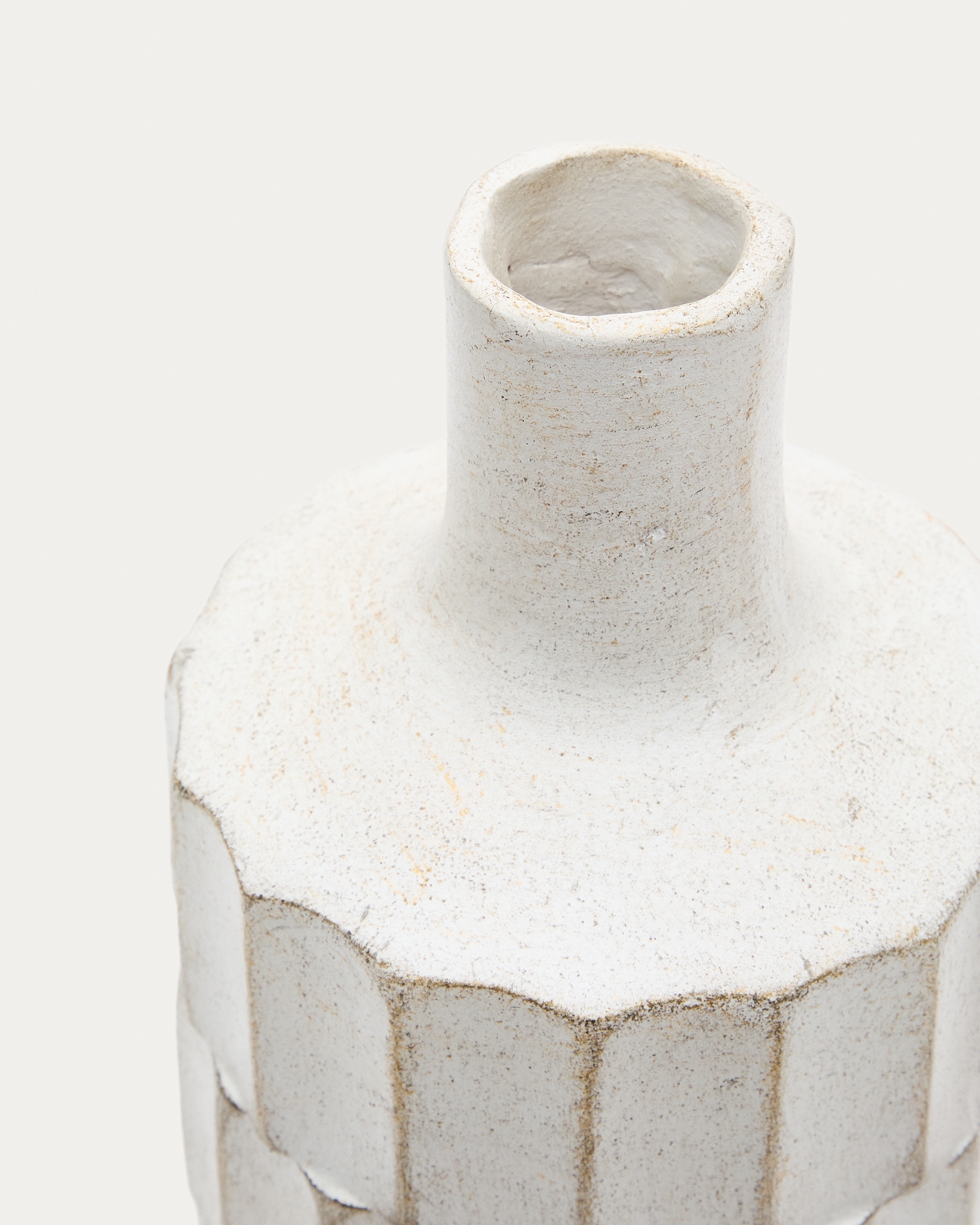 Ваза полностью сделана из переработанной бумаги по технике папье-маше. Простая цилиндрическая форма в полной мере демонстрирует фактурность поверхности, которую также подчеркивает глянцевое белое покрытие.