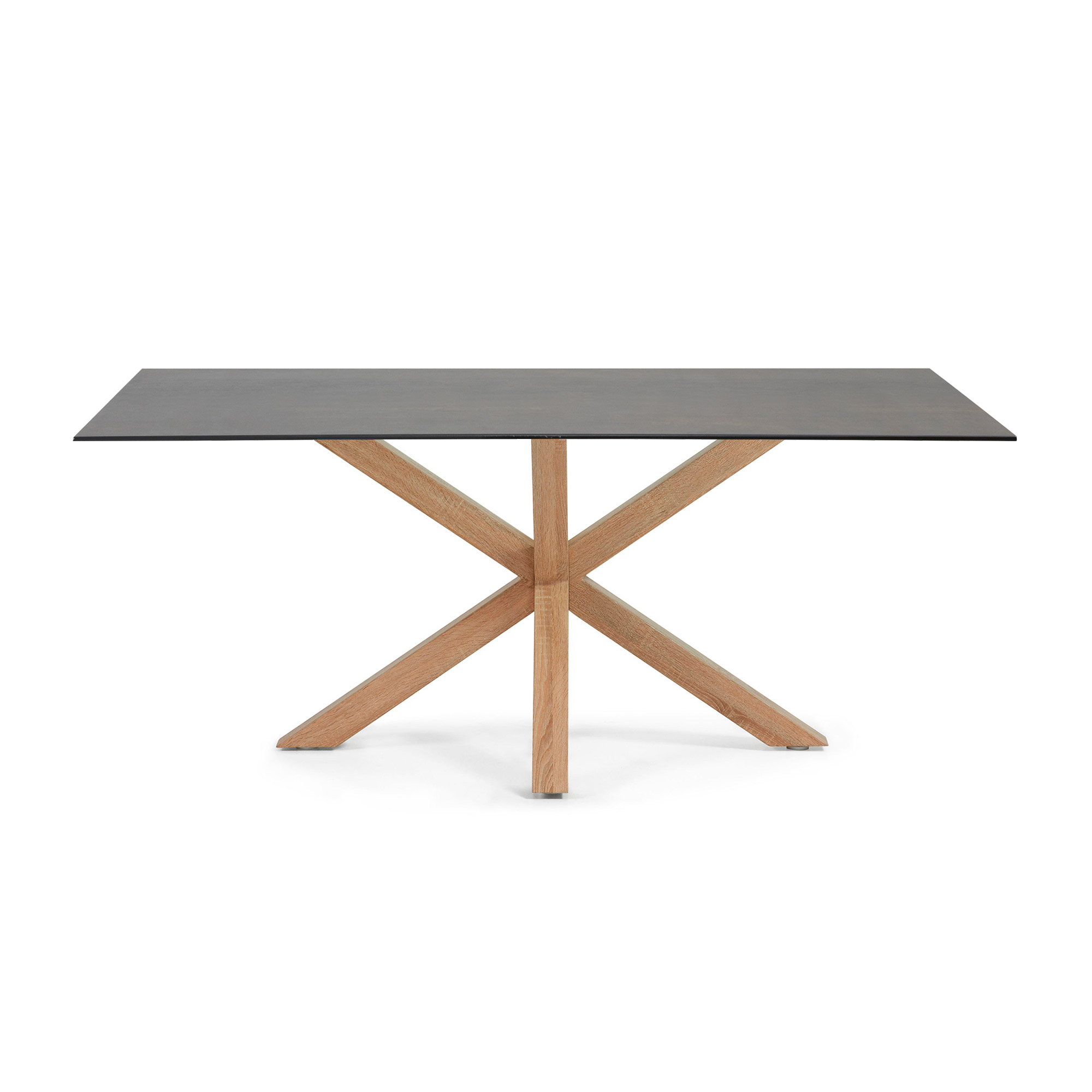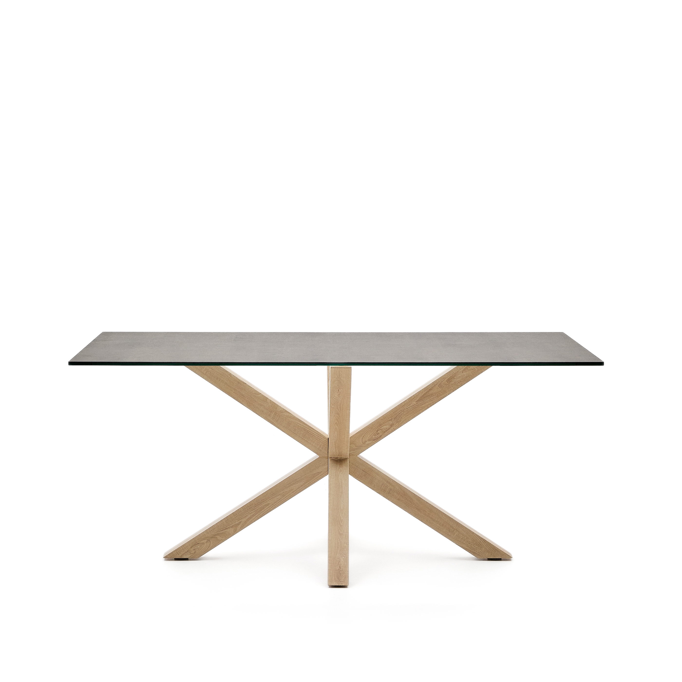 Обеденный стол со стальными ножками в древесной отделке и столешницей из высокотехнологичной фарфоровой плиты со стеклянной опорой. Отделка Iron Moss.