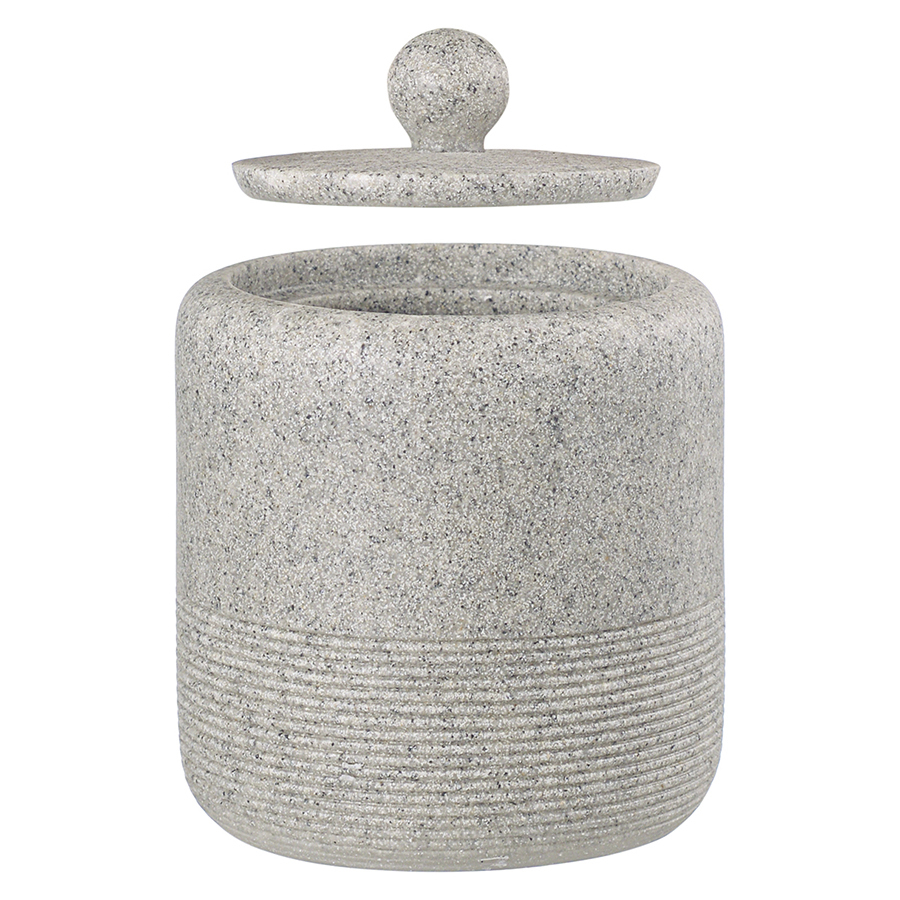 Банка для хранения Loup имеет корпус и крышку из полирезина, стилизованного под натуральный камень темно-серого оттенка. Материал легко моется, отличается устойчивостью к влаге, ударам и царапинам, что делает его идеальным выбором для ванной комнаты. Емкость компактных размеров занимает минимум места на полке или в шкафу. В такой банке можно удобно хранить средства гигиены и другие предметы личного пользования.