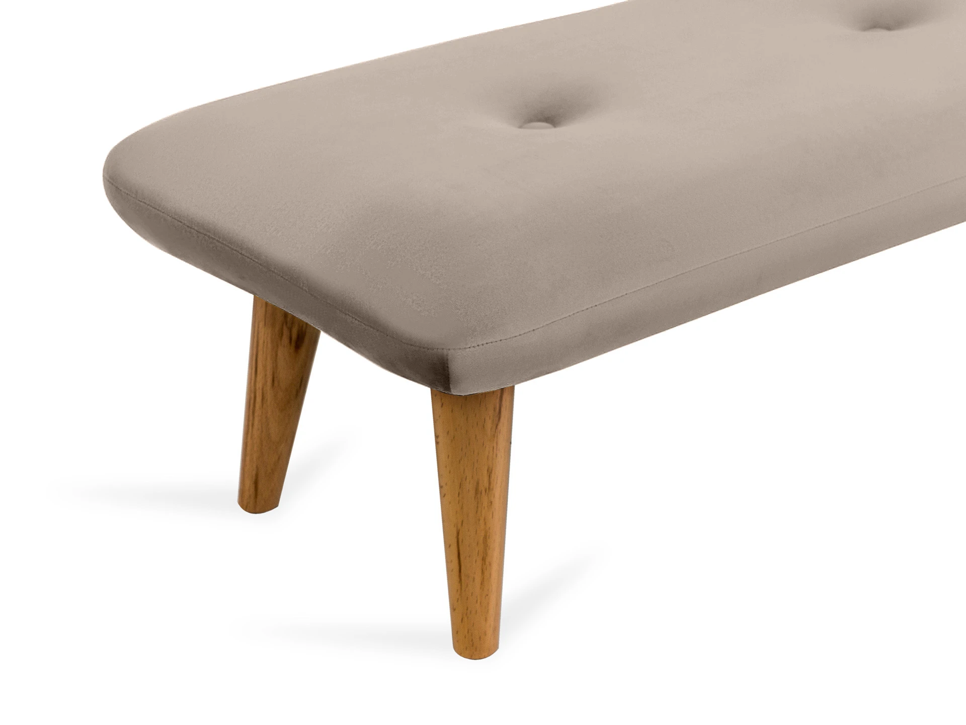 Невысокие (200 мм) ножки изготовлены из массива бука, дополнены фетровыми подпятниками, благодаря которым они не царапают напольное покрытие. Каркас выполнен из брусков дерева хвойных пород. А для максимального комфорта сидящего мы добавили в качестве наполнителя пенополиуретан марки ST (22/36) и синтепон – упругие, удобные, не теряющие формы даже при активном использовании мебели. Чехол из приятной на ощупь фактурной ткани несъёмный, декорирован пуговицами.