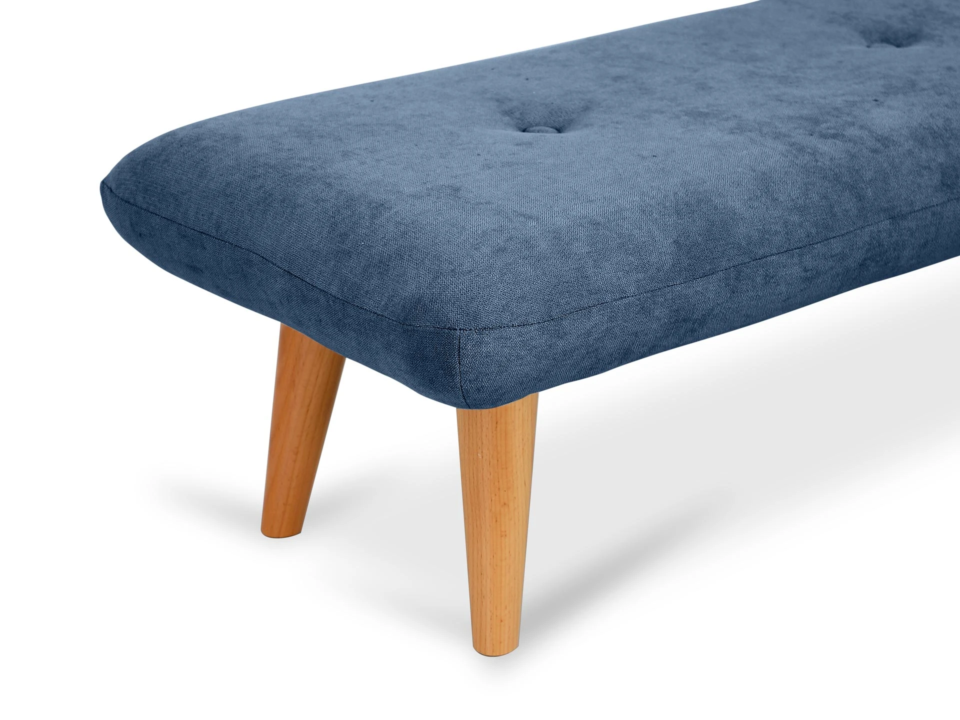Невысокие (200 мм) ножки изготовлены из массива бука, дополнены фетровыми подпятниками, благодаря которым они не царапают напольное покрытие. Каркас выполнен из брусков дерева хвойных пород. А для максимального комфорта сидящего мы добавили в качестве наполнителя пенополиуретан марки ST (22/36) и синтепон – упругие, удобные, не теряющие формы даже при активном использовании мебели. Чехол из приятной на ощупь фактурной ткани несъёмный, декорирован пуговицами.