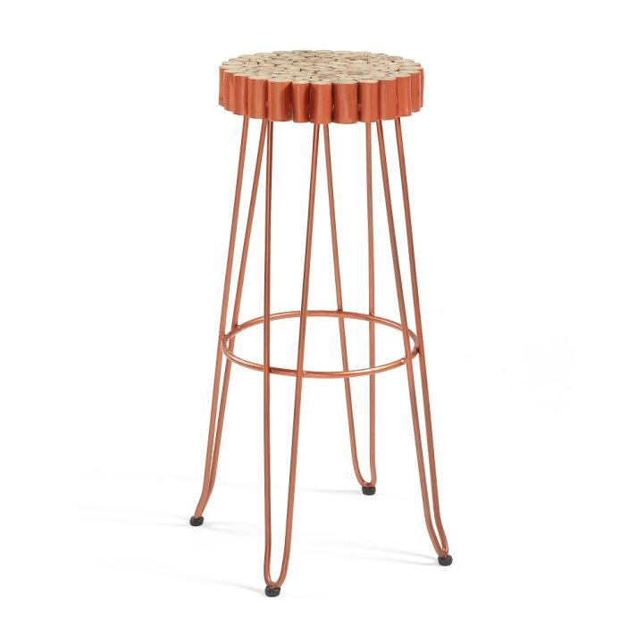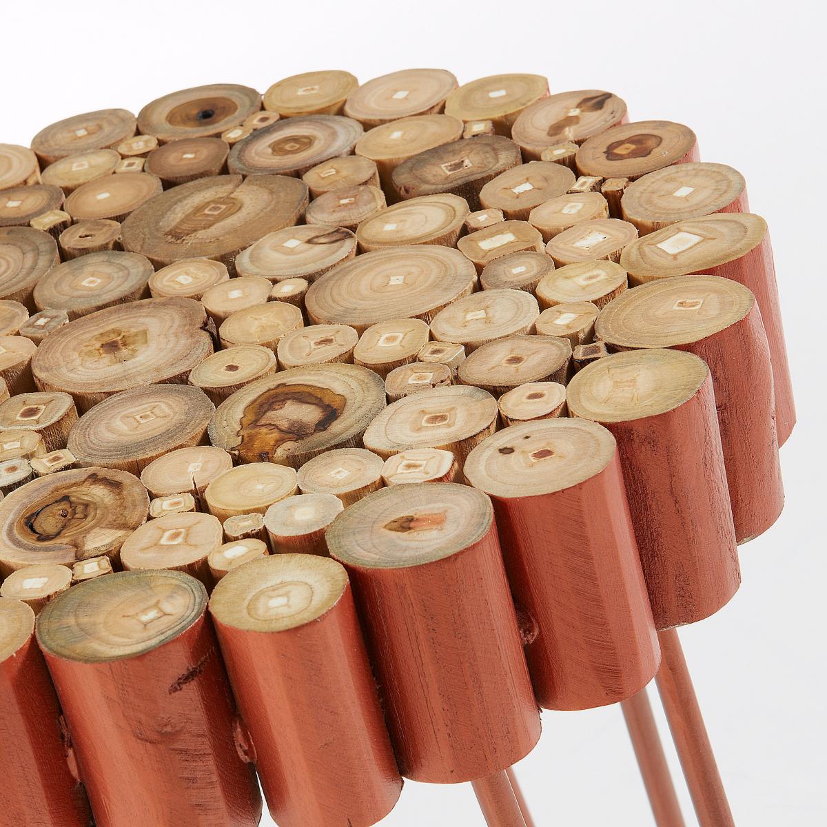 Сиденье сделано из круглых брусков уникальной по своему рисунку и тону древесины. По борту они окрашены, а верхняя часть в натуральной отделке. Высота сиденья – 6 см, диаметр – 35 см.