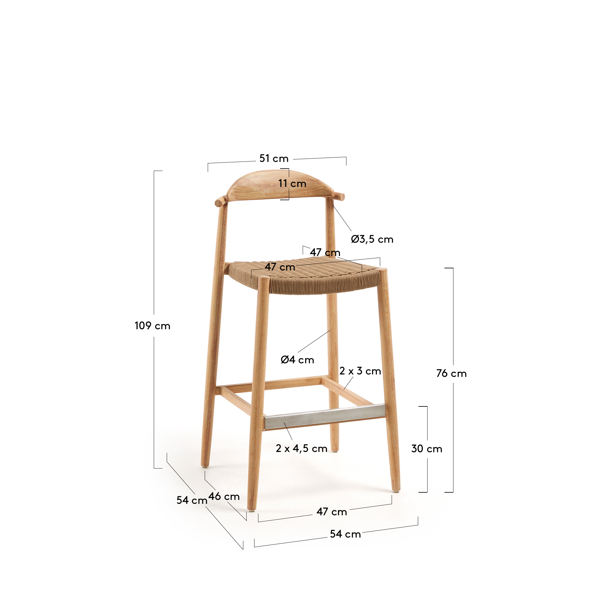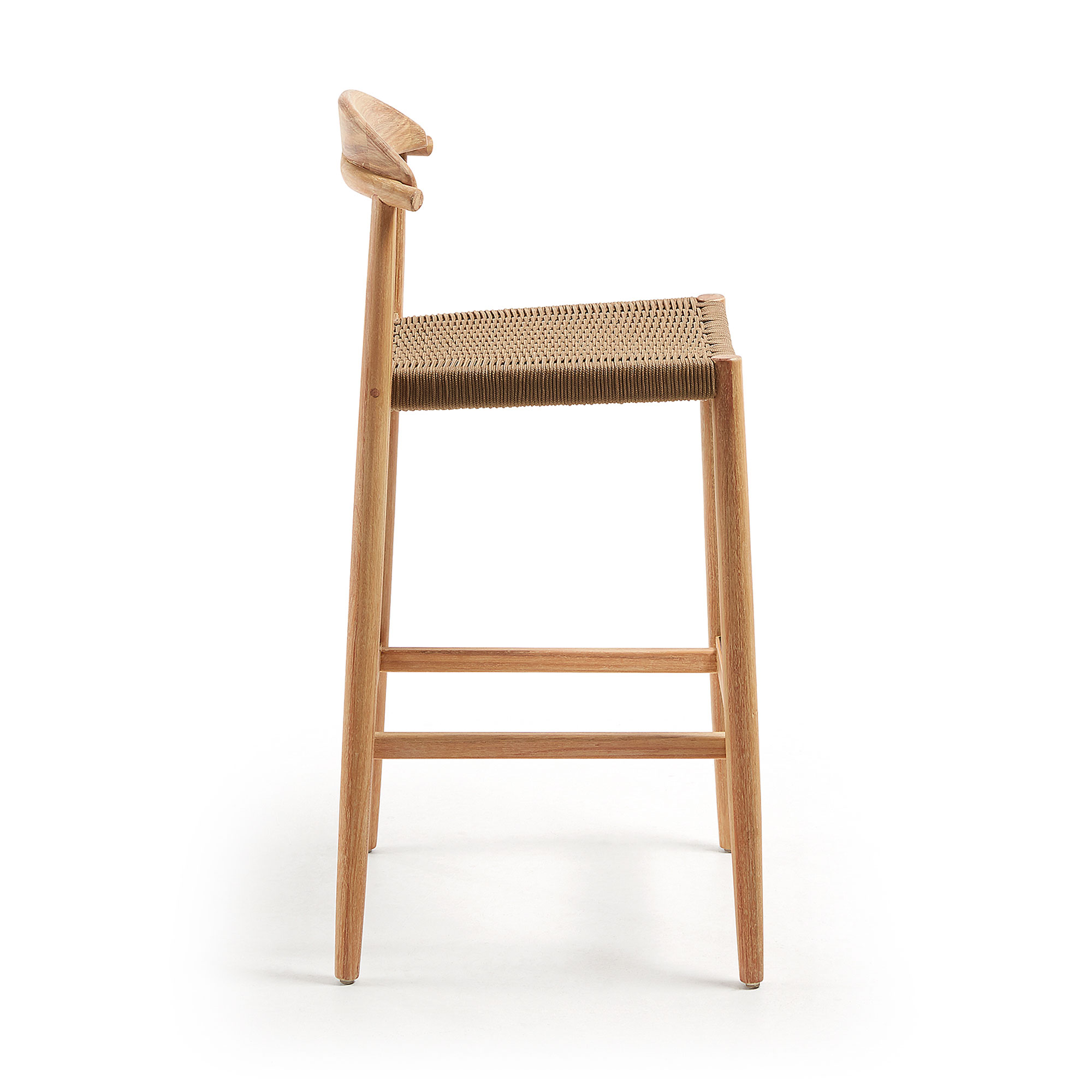 Барный стул 77 см с твердой структурой эвкалипта. С 4 слоя покрытия PU для длительной защиты от ультрафиолетового излучения и долговечности. Сиденье из полиэстера, стабилизированного ультрафиолетом. Составная. Для внутреннего и наружного использования под прикрытием.