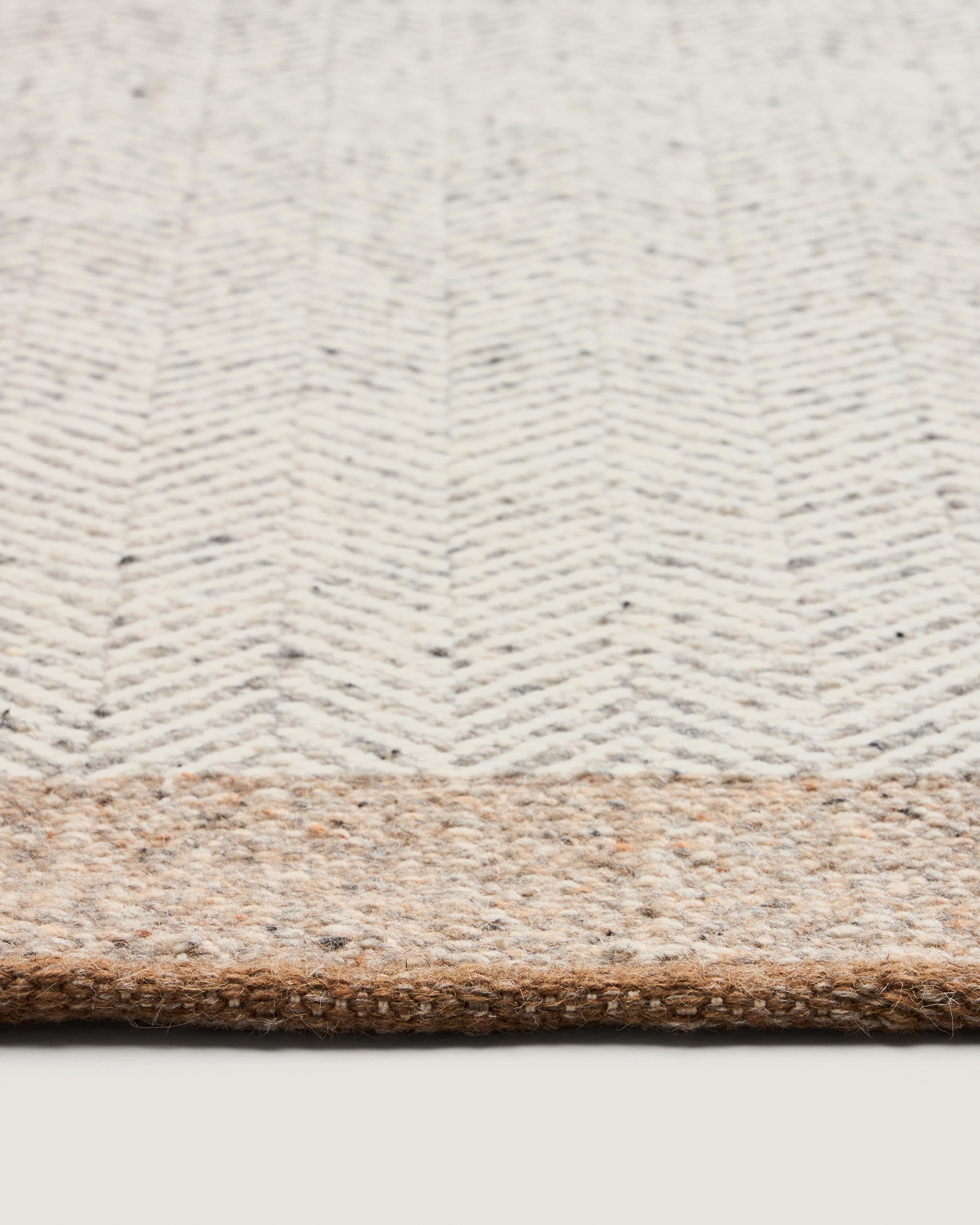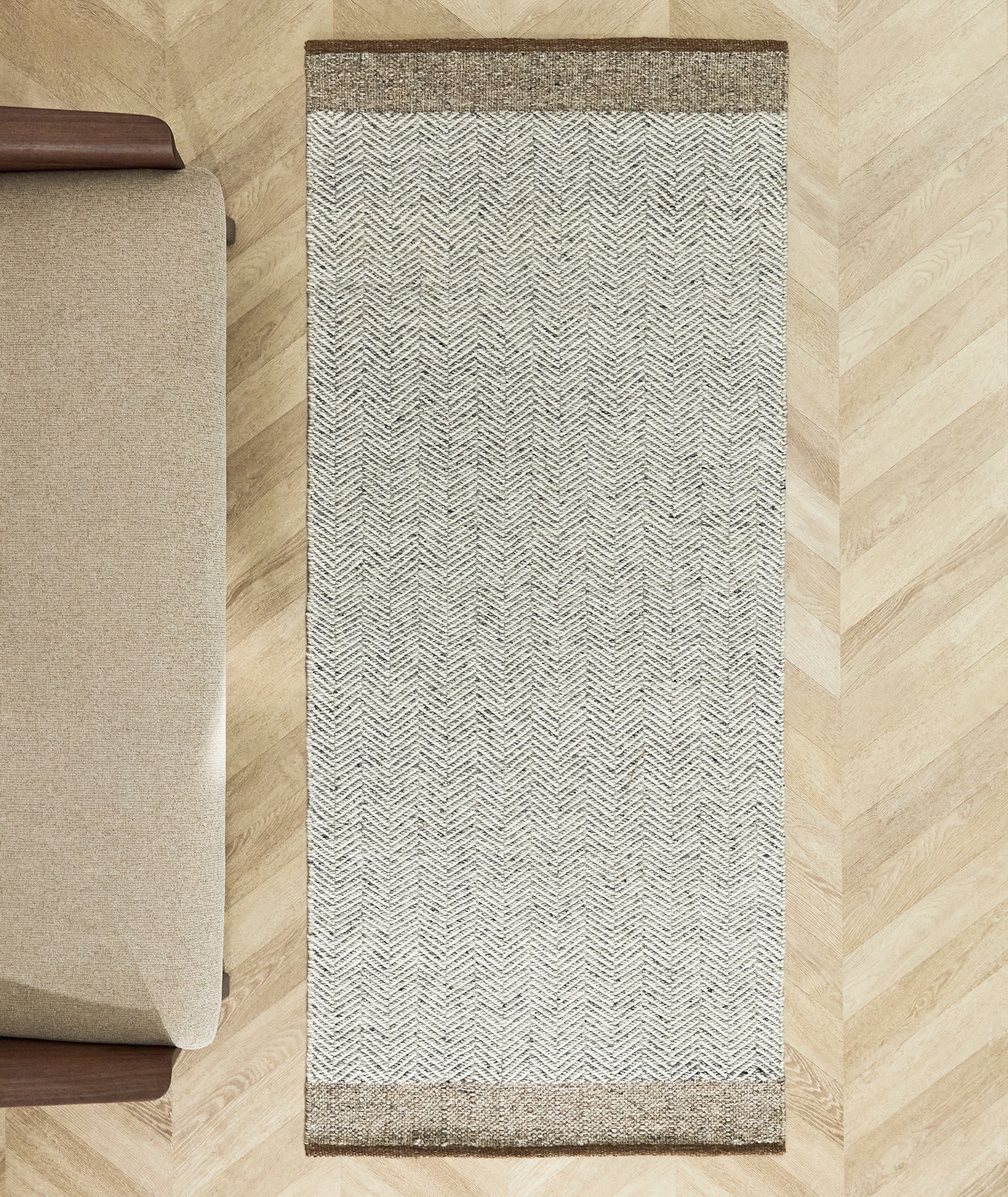 тот ковёр выделяется жаккардовым узором «ёлочка», который добавит динамичности и элегантности любому коридору. Изготовленный из тщательно подобранной шерстяной смеси, он обладает мягкой и тёплой текстурой, идеально подходящей для комфорта ног, а также изысканными бежевыми тонами, которые легко вписываются в интерьеры разных помещений. Каждый ковёр соткан вручную, что обеспечивает эксклюзивную отделку ручной работы, а небольшие вариации подчёркивают его аутентичность.