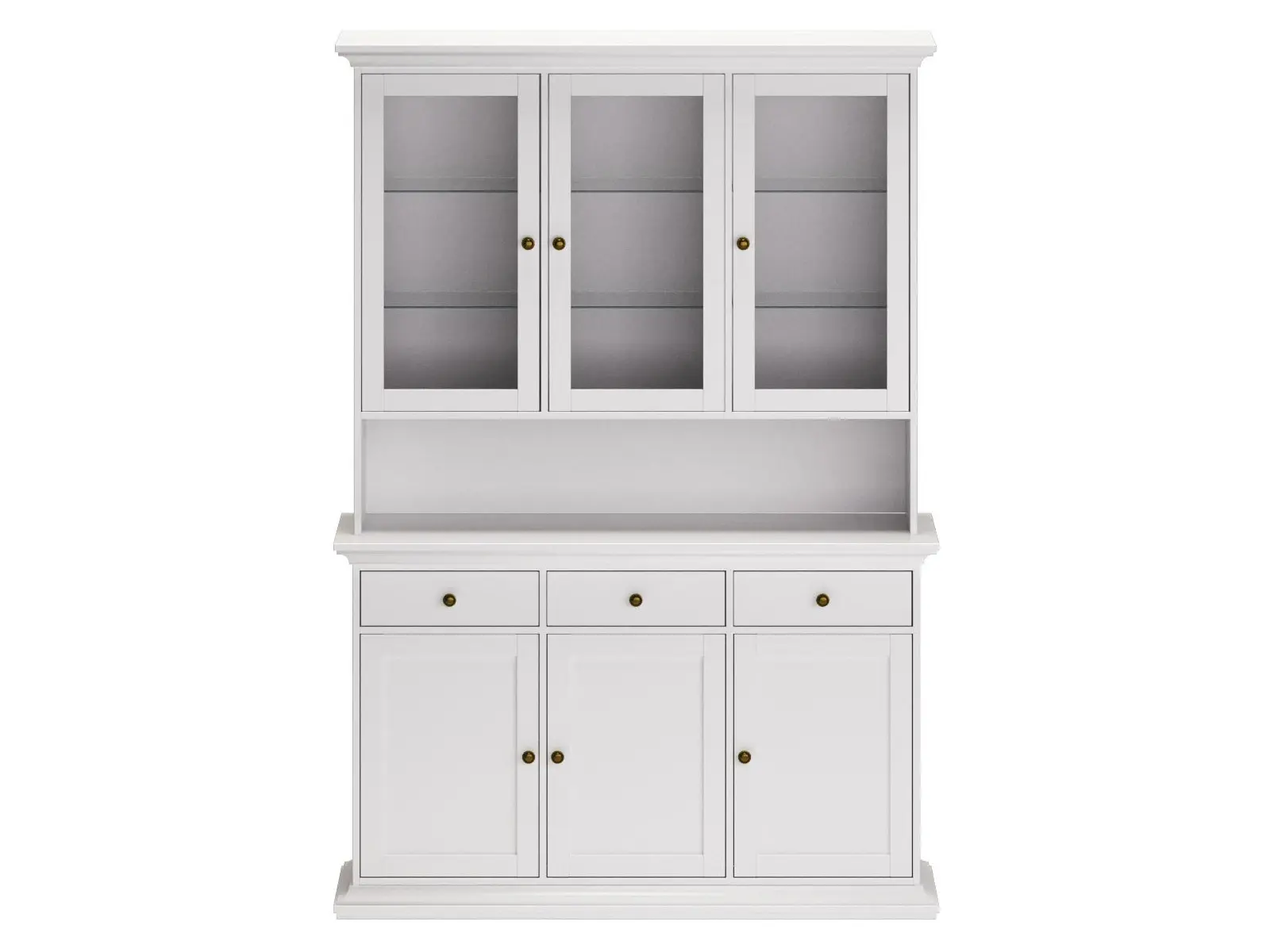 Буфет для хранения посуды. В верхнем отделении за стеклянными дверцами располагаются полки. В нижнем расположены выдвижные ящики и отделения с полками за деревянными дверцами.