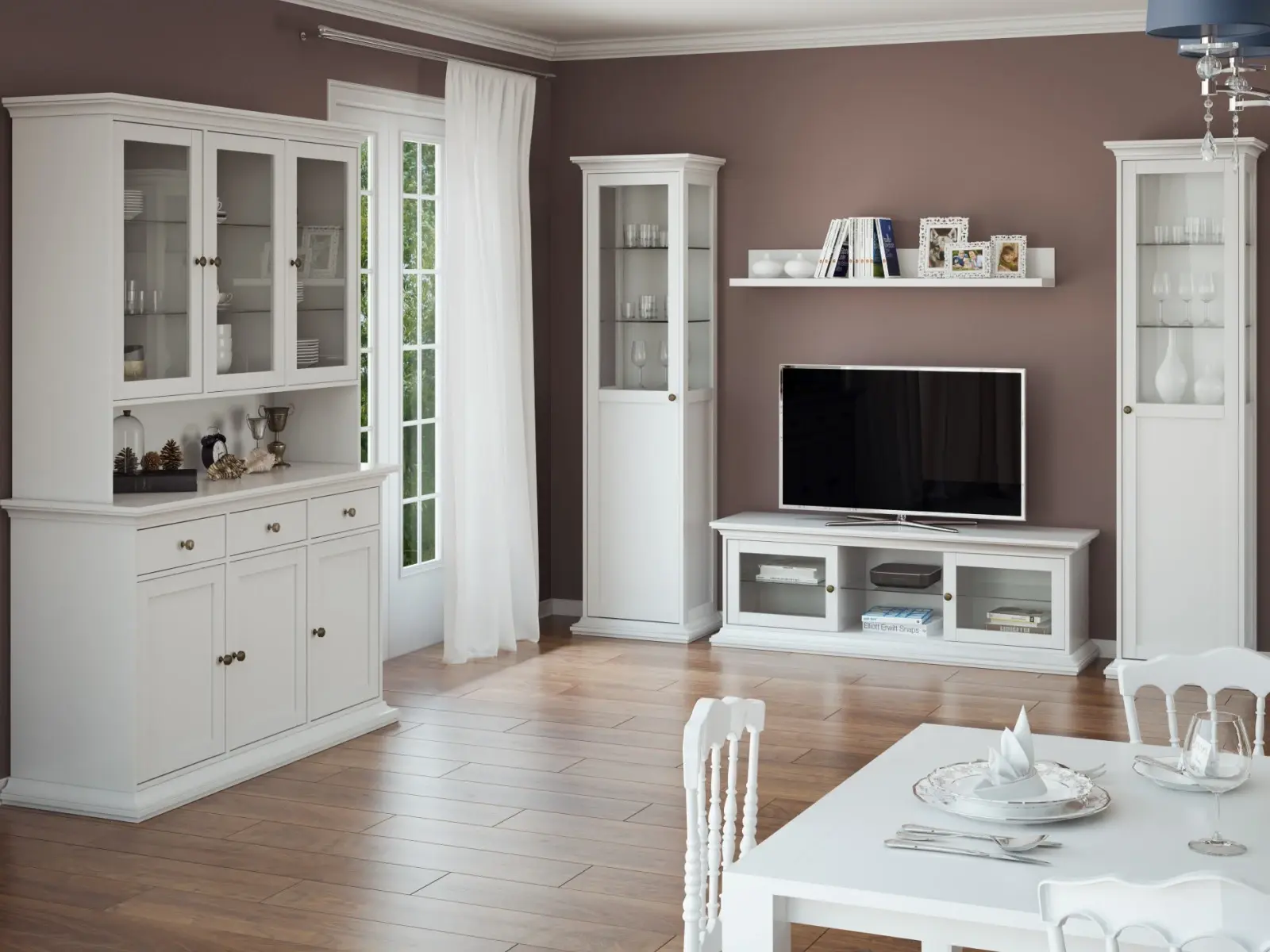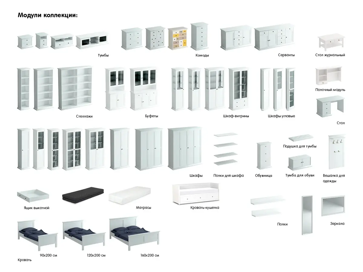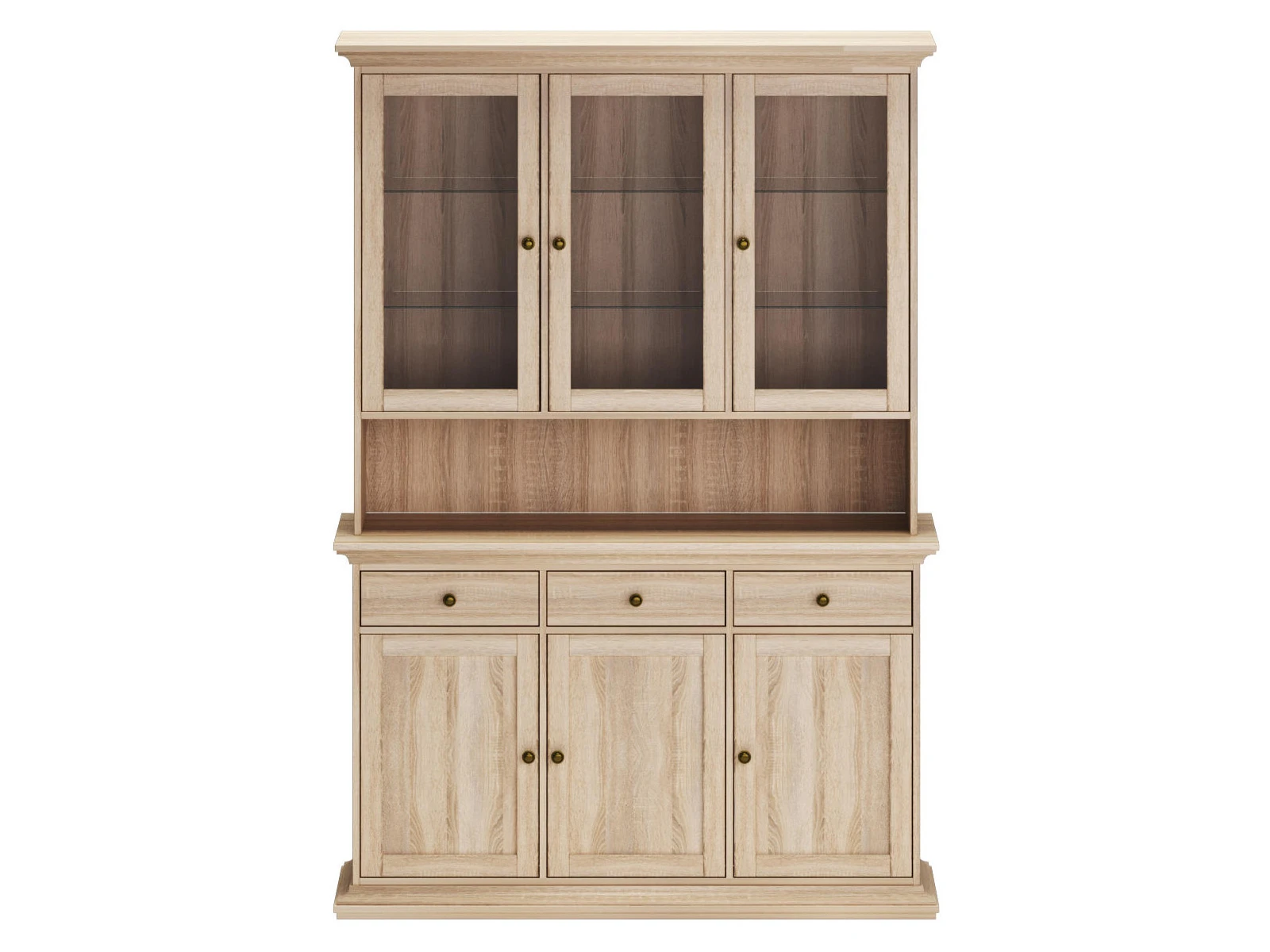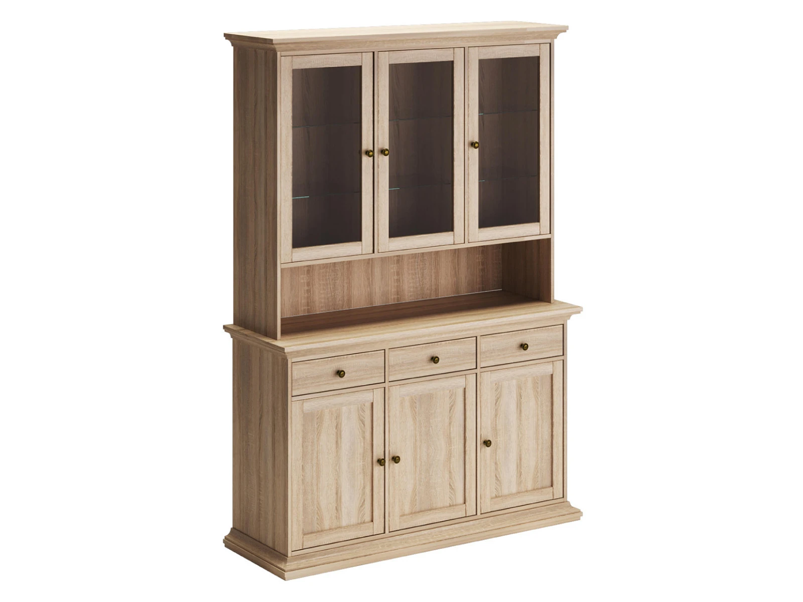 Буфет для хранения посуды. В верхнем отделении за стеклянными дверцами располагаются полки. В нижнем расположены выдвижные ящики и отделения с полками за деревянными дверцами.