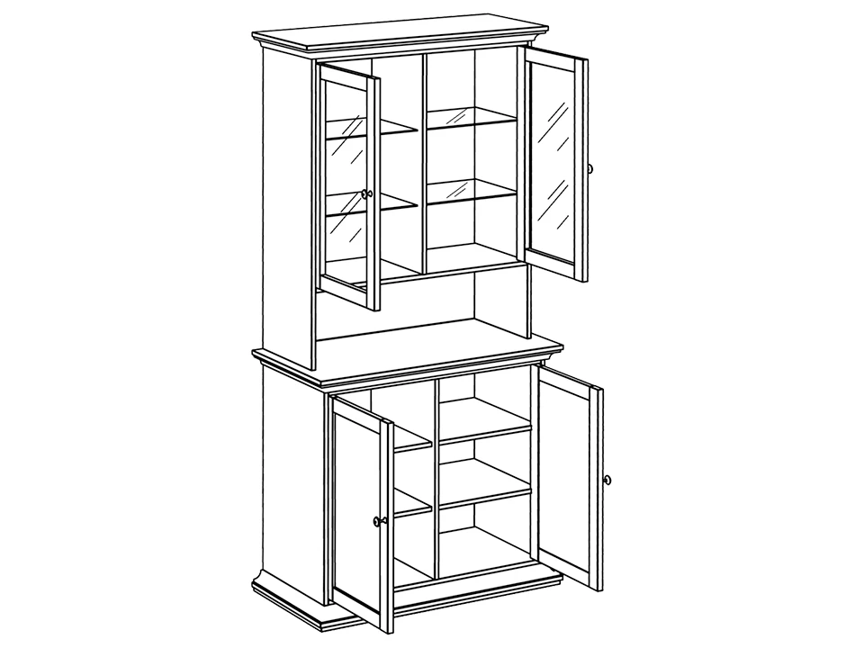 Буфет для хранения посуды состоит из верхнего отделения со стеклянными дверцами и нижнего с деревянными дверцами. В верхнем и нижнем отделение расположены полки.