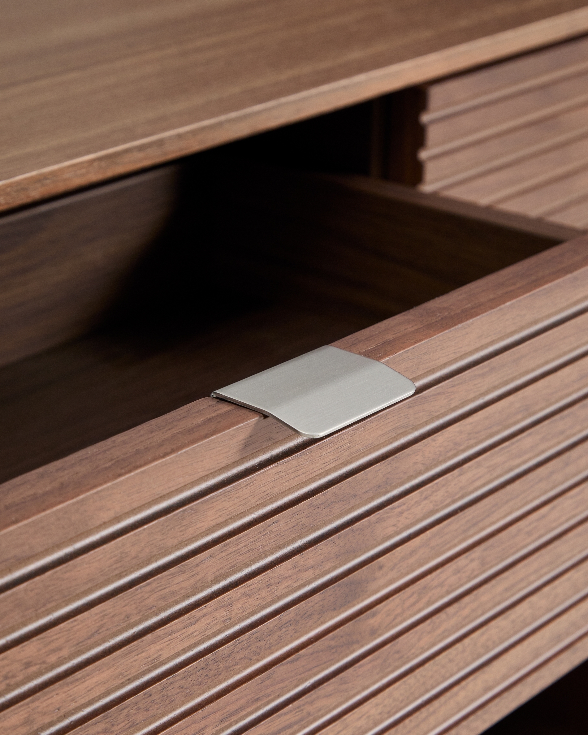 Norlen отдаёт дань уважения дизайну 1950-х годов в современной интерпретации, сочетая минималистичные формы и винтажные детали. Слегка закруглённые углы и деревянное основание создают ностальгическую атмосферу, переосмысленную благодаря чистым линиям и современным пропорциям. Тёмный ореховый шпон, нанесённый методом вакуумной мембранной печати, идеально подходит к радиусам мебели, объединяя отделку и придавая глубину и индивидуальность каждому предмету. Он покрыт полиуретановым лаком, обеспечивающим устойчивость к износу и влаге.