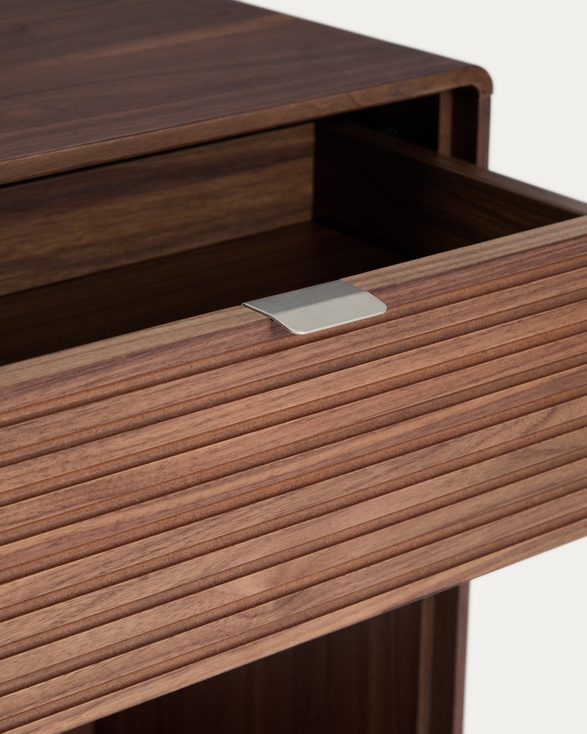 Norlen отдаёт дань уважения дизайну 1950-х годов в современной интерпретации, сочетая минималистичные формы и винтажные детали. Слегка закруглённые углы и деревянное основание создают ностальгическую атмосферу, переосмысленную благодаря чистым линиям и современным пропорциям. Тёмный ореховый шпон, нанесённый методом вакуумной мембранной печати, идеально подходит к радиусам мебели, объединяя отделку и придавая глубину и индивидуальность каждому предмету. Он покрыт полиуретановым лаком, обеспечивающим устойчивость к износу и влаге.