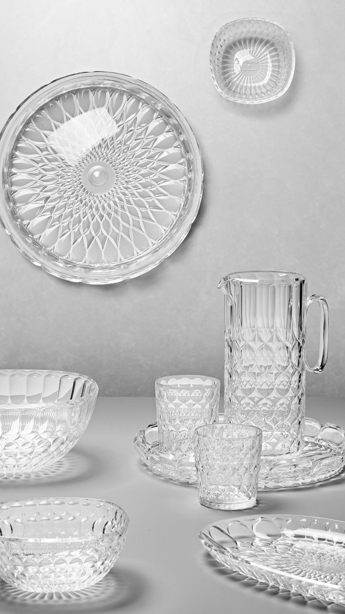 Чаша Vanity от итальянского бренда Guzzini – необычная посуда из специального акрилового стекла, произведенного на биооснове из современного, органического сырья, которое получается из растительных отходов. Материал на 100% подлежит вторичной переработке. За счет особенной рельефной поверхности предмет изящно переливается на свету, что делает его еще более привлекательным.