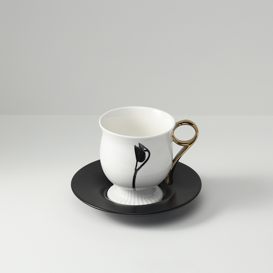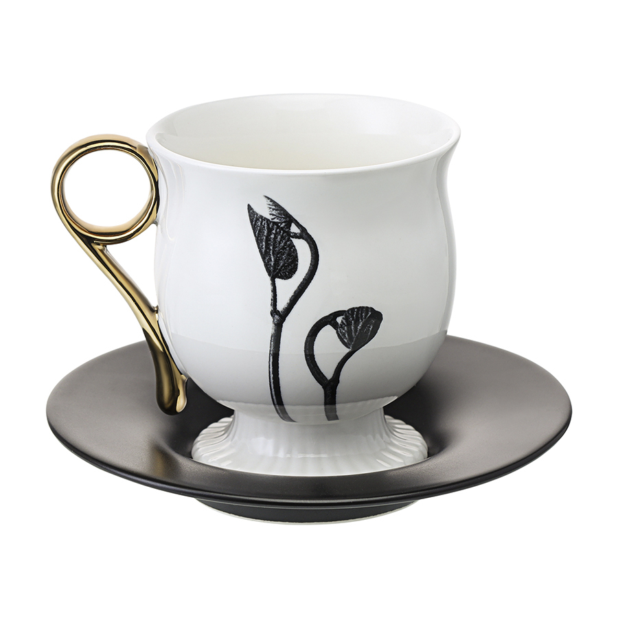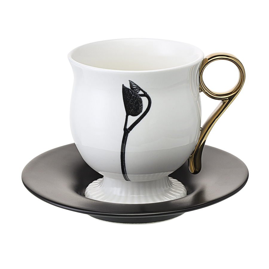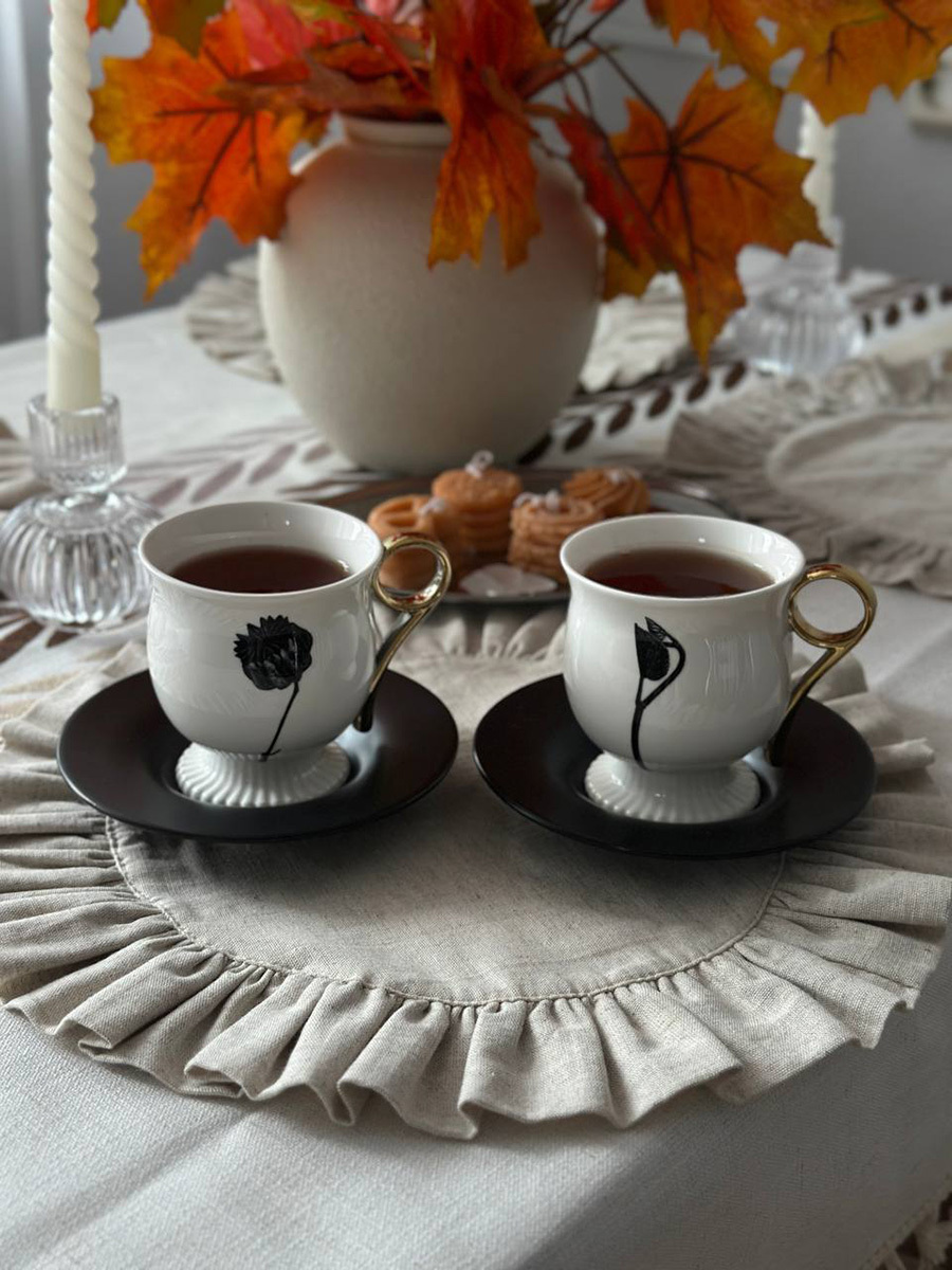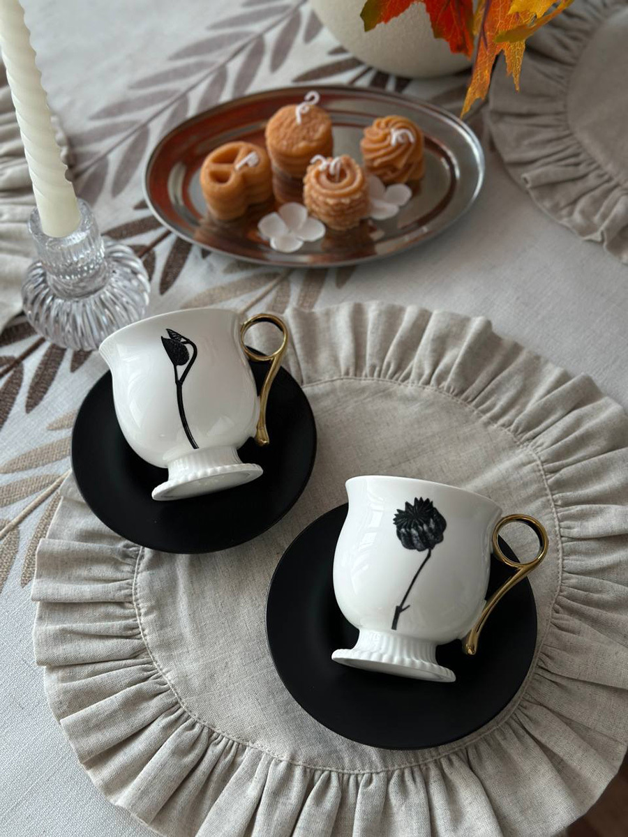 - Белоснежная чашка в сочетании с черным блюдцем создают эффектный контраст, акцентируя внимание на стильной сервировке.