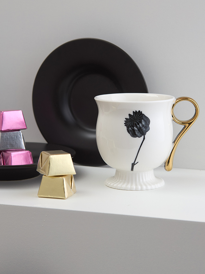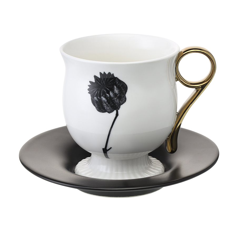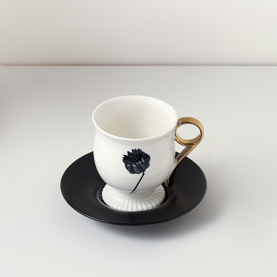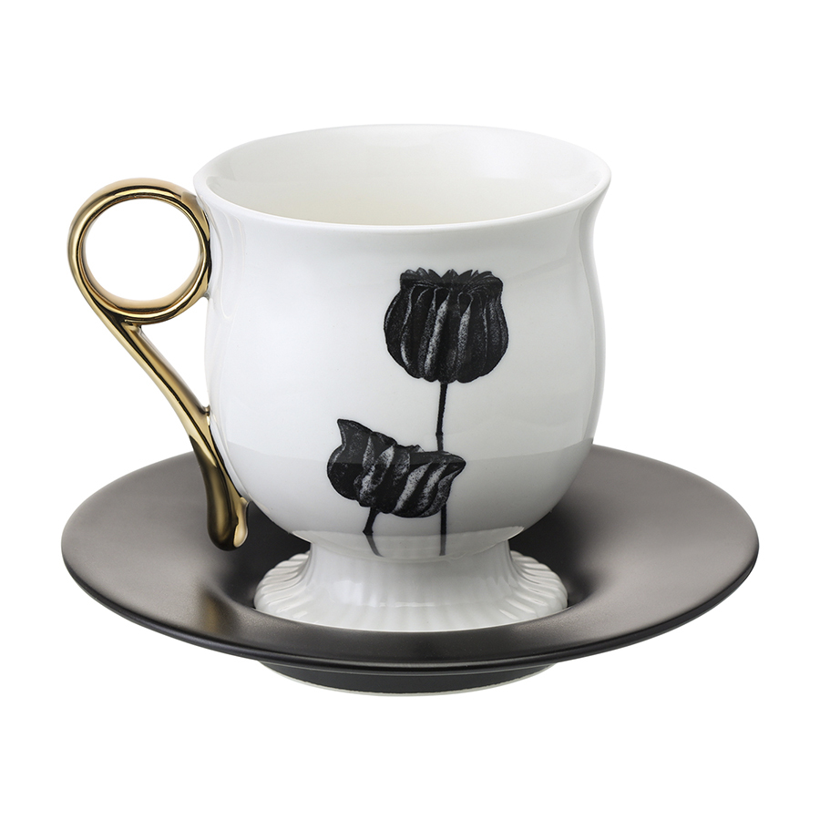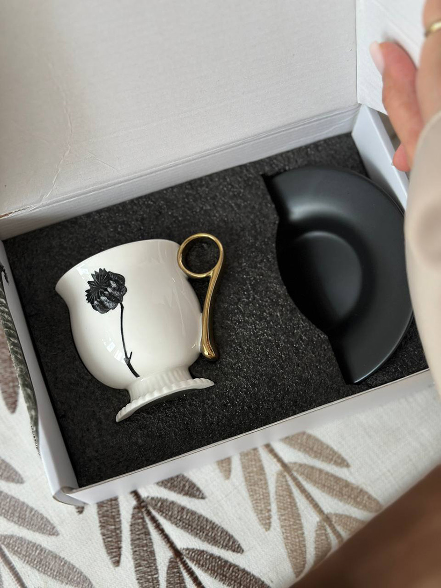 - Белоснежная чашка в сочетании с черным блюдцем создают эффектный контраст, акцентируя внимание на стильной сервировке.