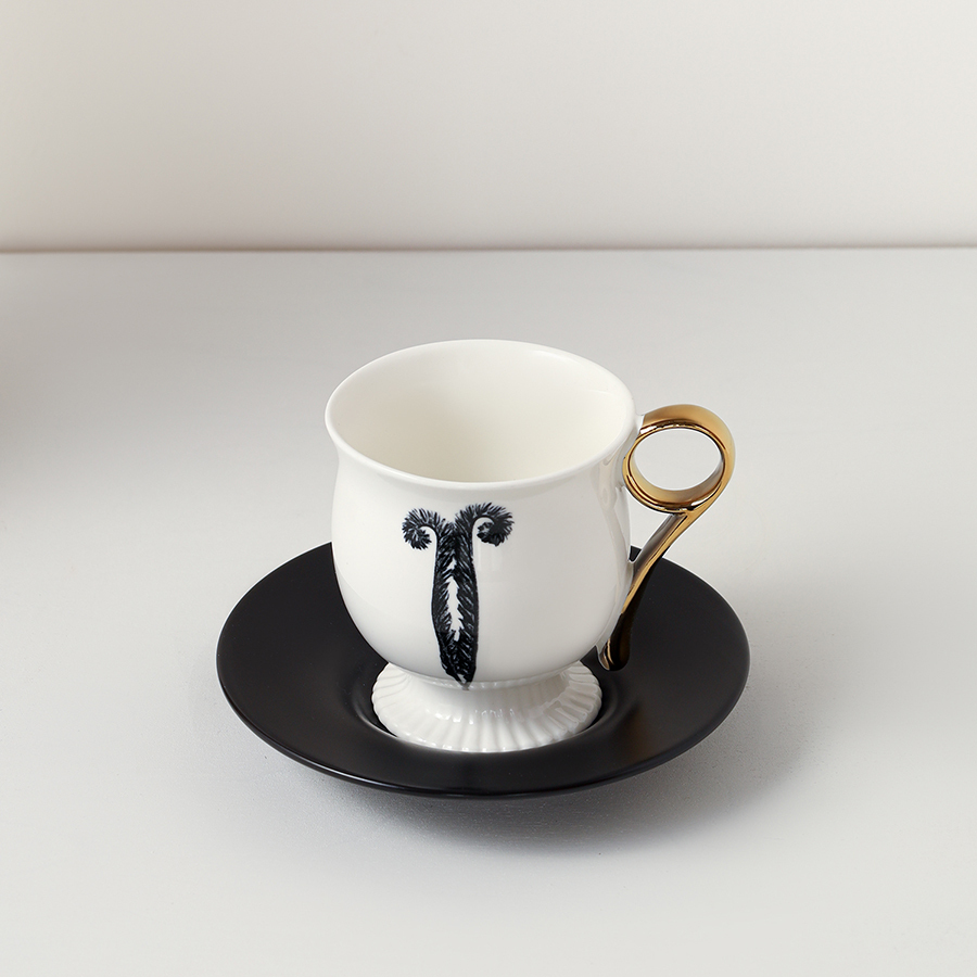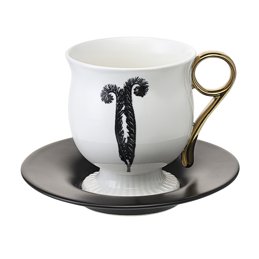 - Белоснежная чашка в сочетании с черным блюдцем создают эффектный контраст, акцентируя внимание на стильной сервировке.