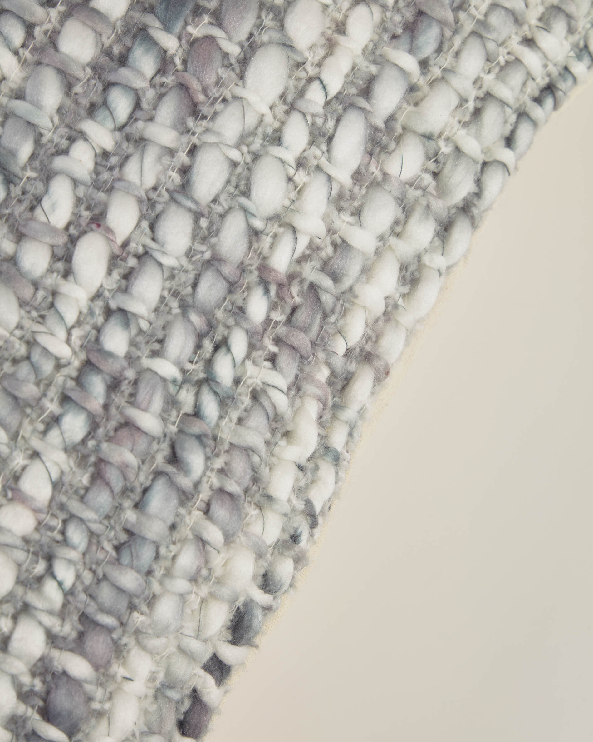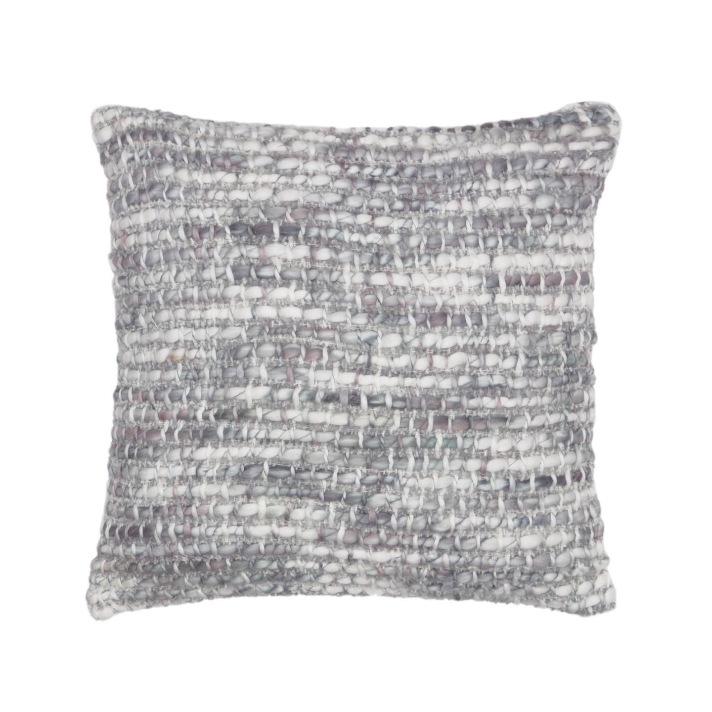 Чехол имеет квадратную форму. Он сшит из связанного полотна серо-белого цвета.