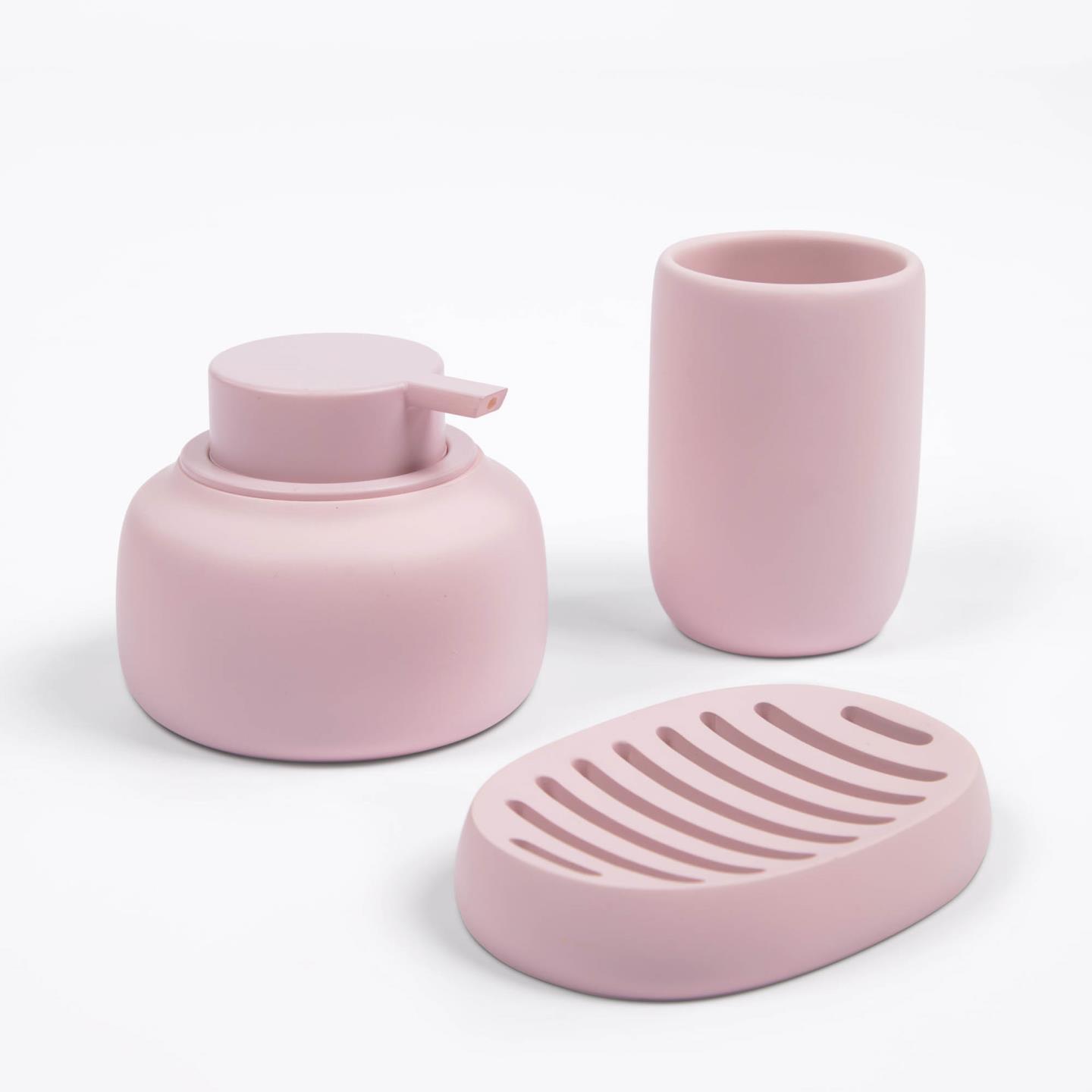 Размеры: дозатор – 11 х 9,5 х 11 см; мыльница – 13 х 2,5 х 9 см; стакан для зубных щеток – 7 х 10 х 7 см.
