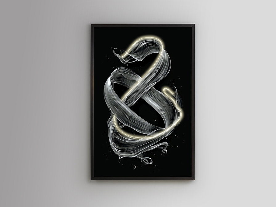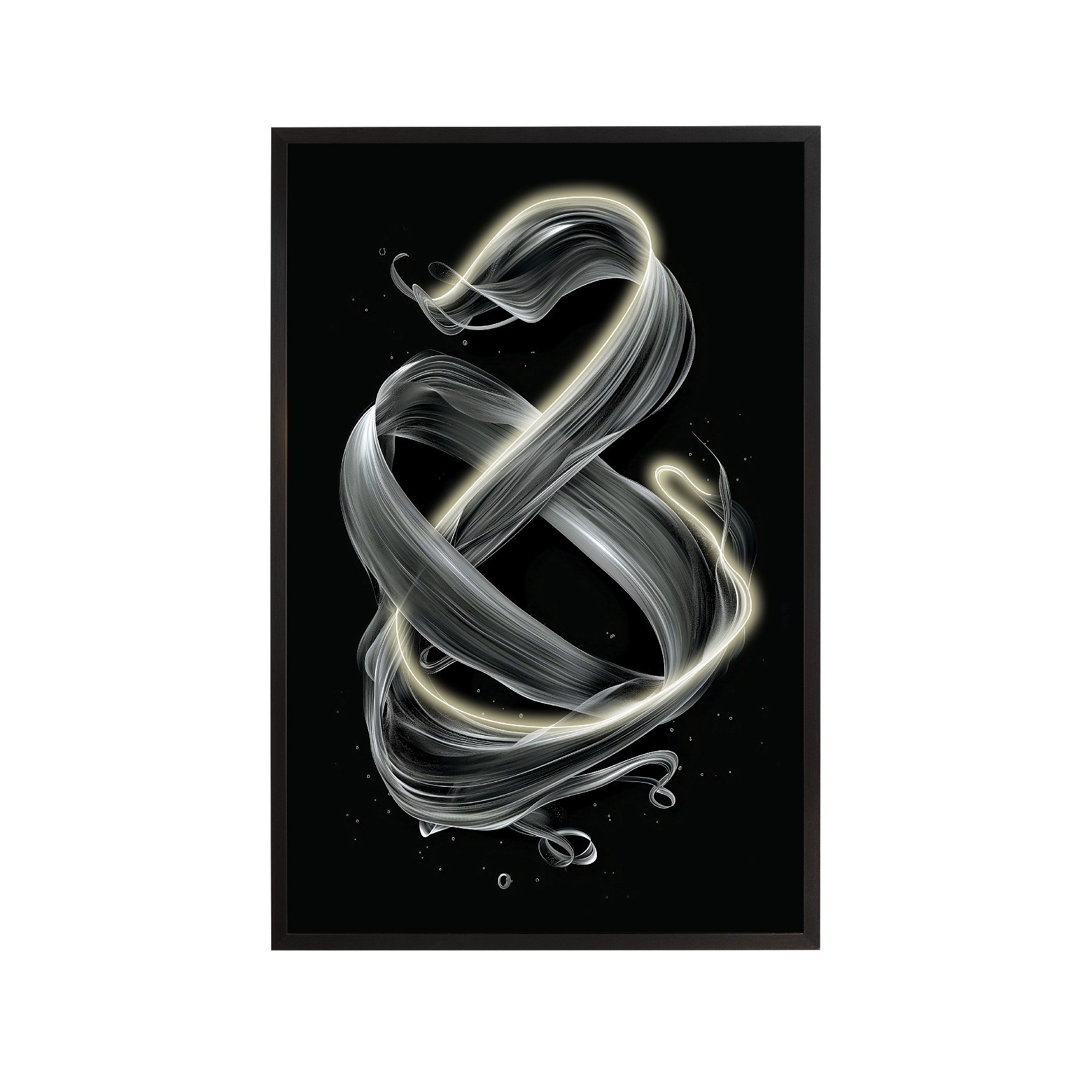 Кинетическая композиция с декоративной светодиодной лентой. Холст с принтом, наклеенный на картон и обрамленный в черный цвет.