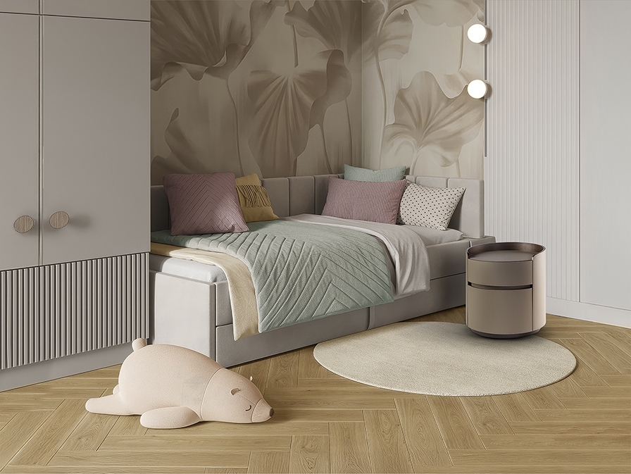 Круглый ночной столик с двумя ящиками на направляющих. Изготовлен из ореховой фанеры, обтянут бежевой кожей. Столешница из фарфора, отделка под мрамор с прожилками.