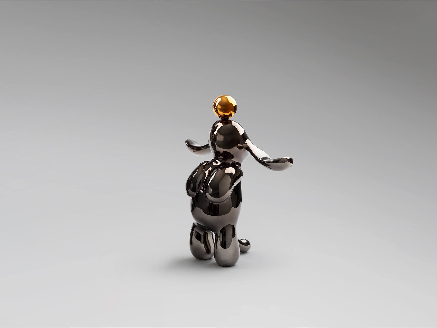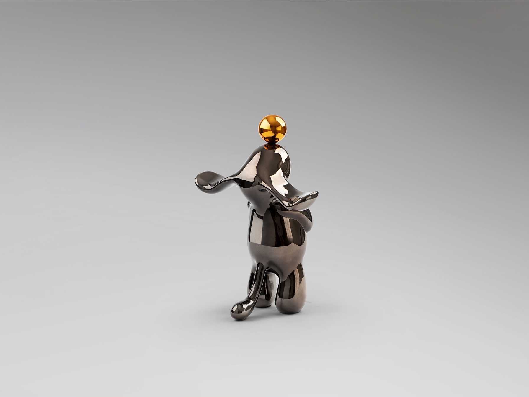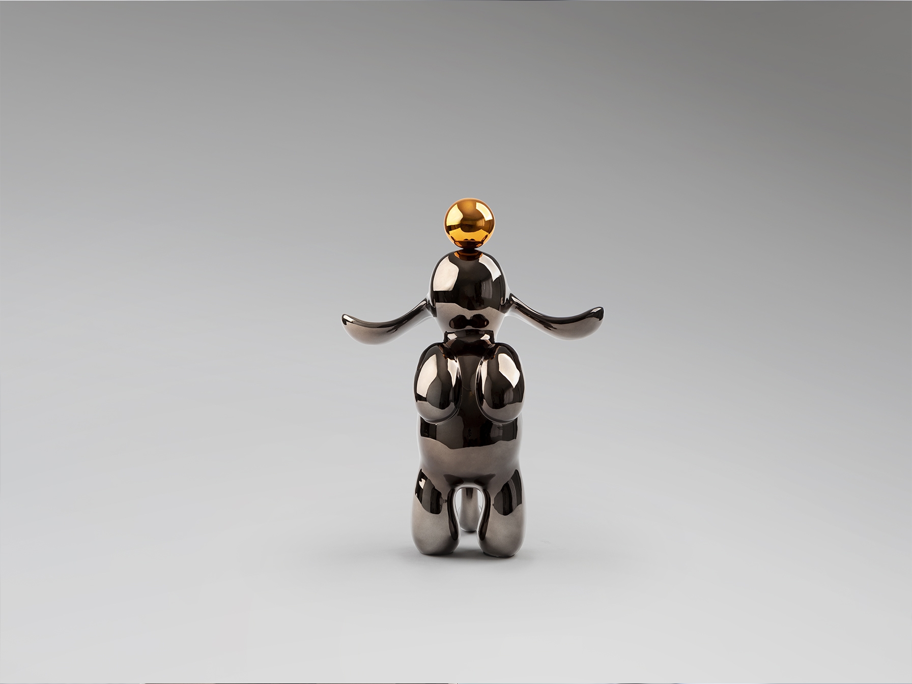 Круглая фигурка кролика, небольшого размера. Изготовлена из смолы, покрыта металлическим свинцово-серым и оранжевым цветом.