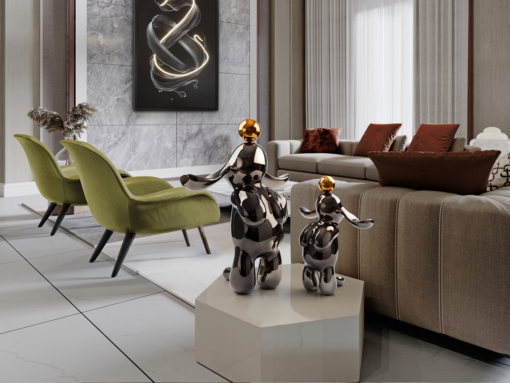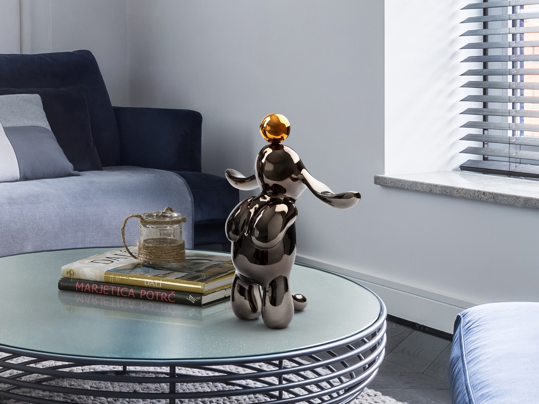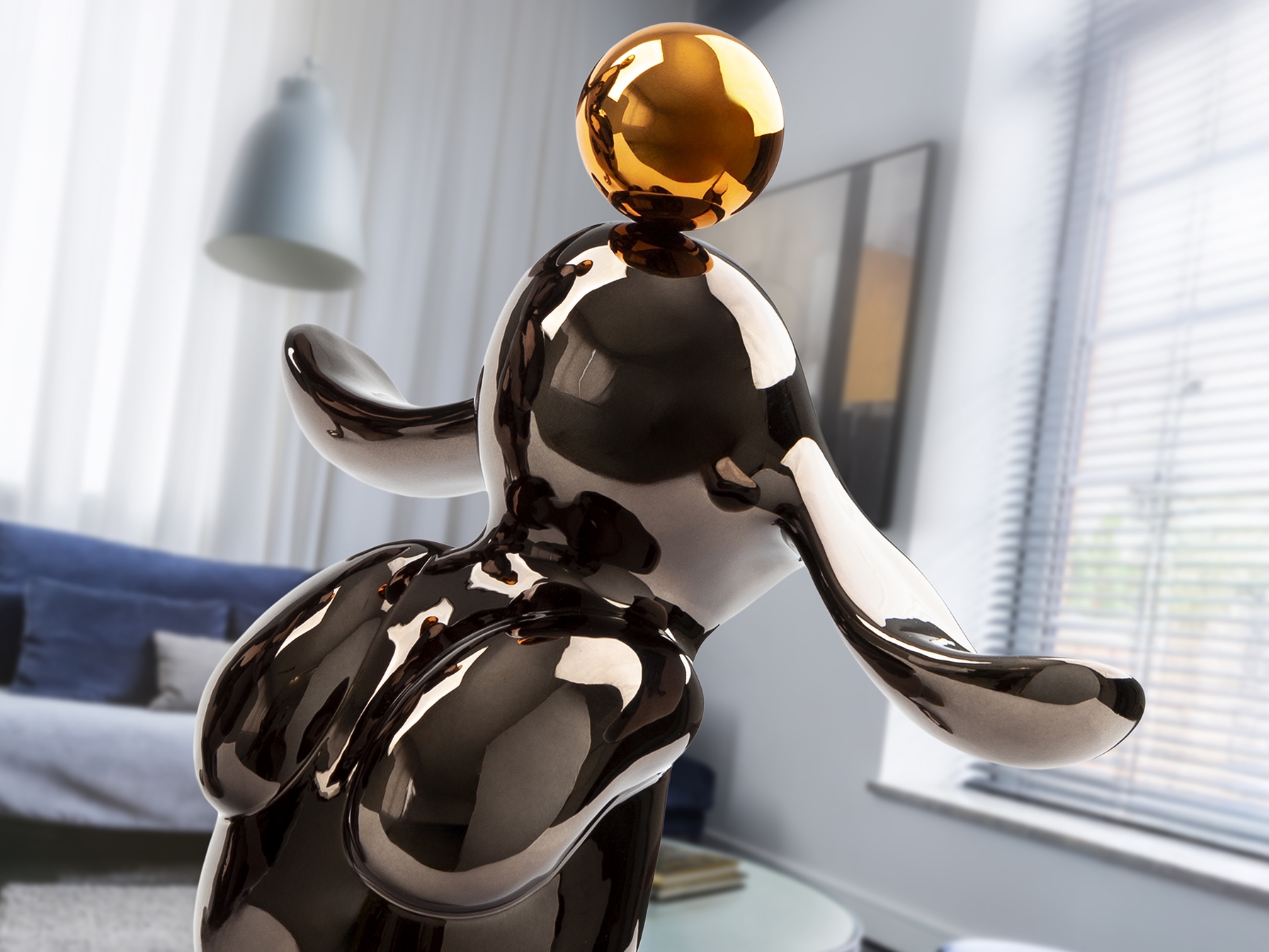 Круглая фигурка кролика, небольшого размера. Изготовлена из смолы, покрыта металлическим свинцово-серым и оранжевым цветом.