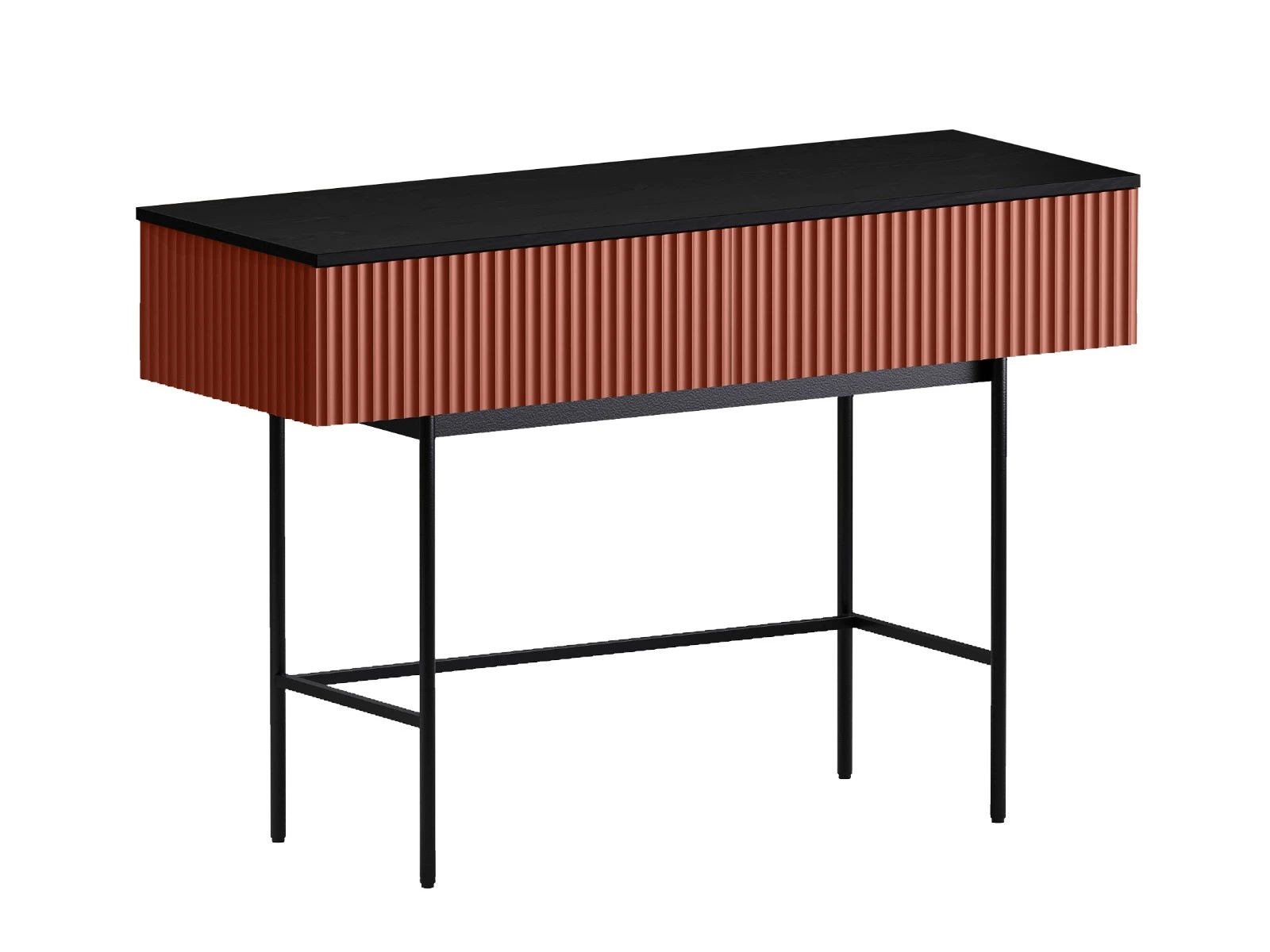 Стол консольный Mikko установлен на высокое металлическое основание черного цвета, стойки которого выполнены из круглой трубы d 20 мм, верхний пояс царг аналогичен остальным изделиям, а нижний пояс из квадратной трубы 15*15 мм. В столе два ящика на скрытых направляющих. Скрытые направляющие INNER Push-open (нажал-открыл) - МакМарт. Дно ящиков – ДВПО 3,2 мм. Основание металлическое, окрашено черной эмалью, высотой 600 мм, с пластиковыми регулируемыми подпятниками. Стол консольный рекомендуется крепить к стене для защиты от опрокидывания (крепежи входят в комплект).