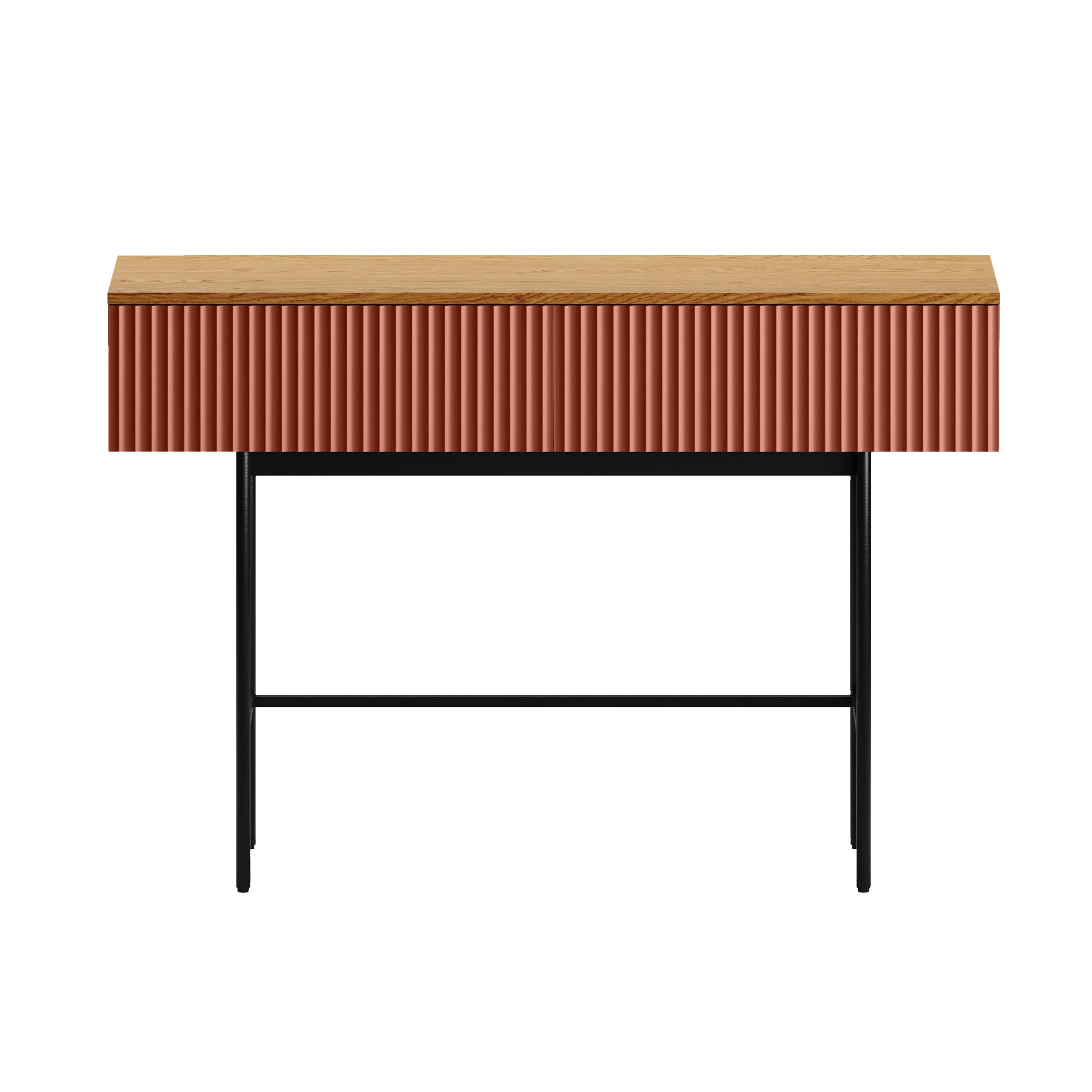 Стол консольный Mikko установлен на высокое металлическое основание черного цвета, стойки которого выполнены из круглой трубы d 20 мм, верхний пояс царг аналогичен остальным изделиям, а нижний пояс из квадратной трубы 15*15 мм. В столе два ящика на скрытых направляющих. Скрытые направляющие INNER Push-open (нажал-открыл) - МакМарт. Дно ящиков – ДВПО 3,2 мм. Основание металлическое, окрашено черной эмалью, высотой 600 мм, с пластиковыми регулируемыми подпятниками. Стол консольный рекомендуется крепить к стене для защиты от опрокидывания (крепежи входят в комплект).