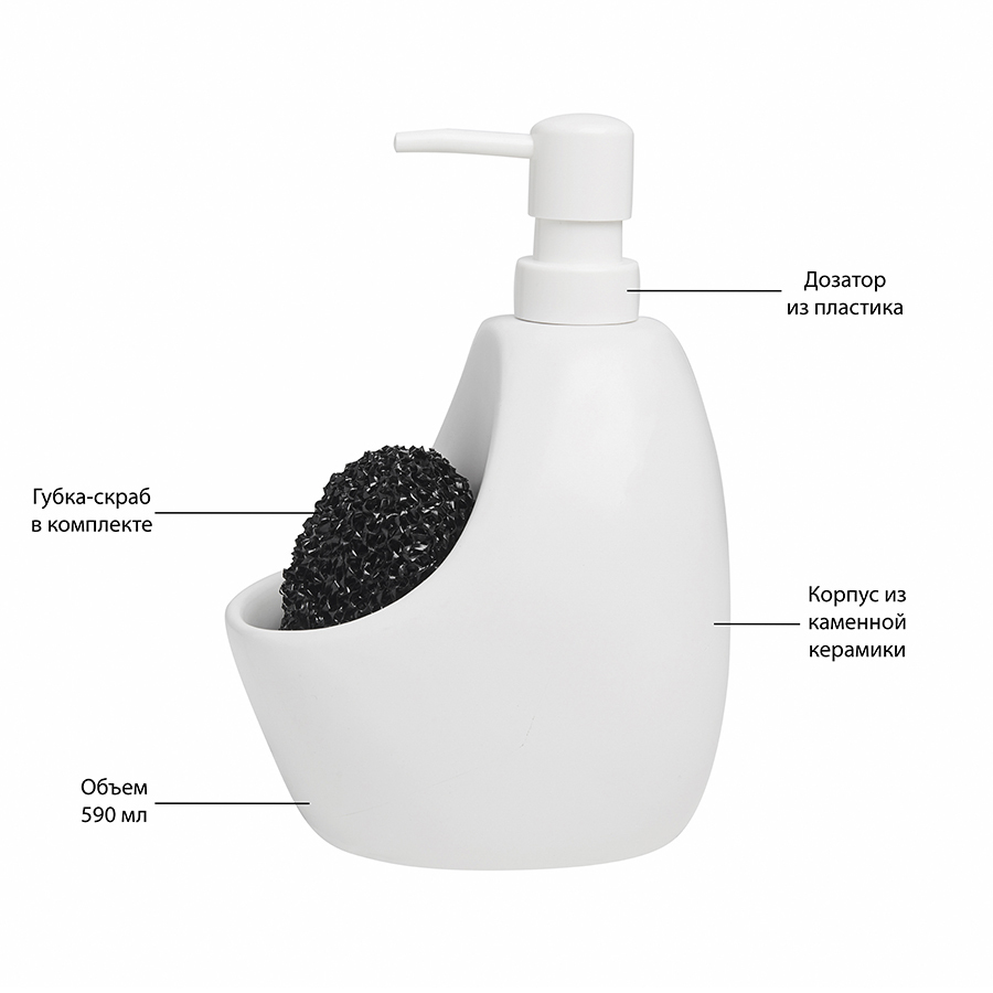 Диспенсер Joey поможет навести порядок в зоне раковины и облегчит процесс мытья посуды. Выполненный из керамики, он не только практичный и долговечный, но и стильно смотрится в интерьере. Объем 590 мл обеспечивает длительное использование без необходимости дозаправки. Моющее средство дозируется экономно через удобный длинный носик. В конструкции предусмотрено отделение для губки, которая входит в комплект.