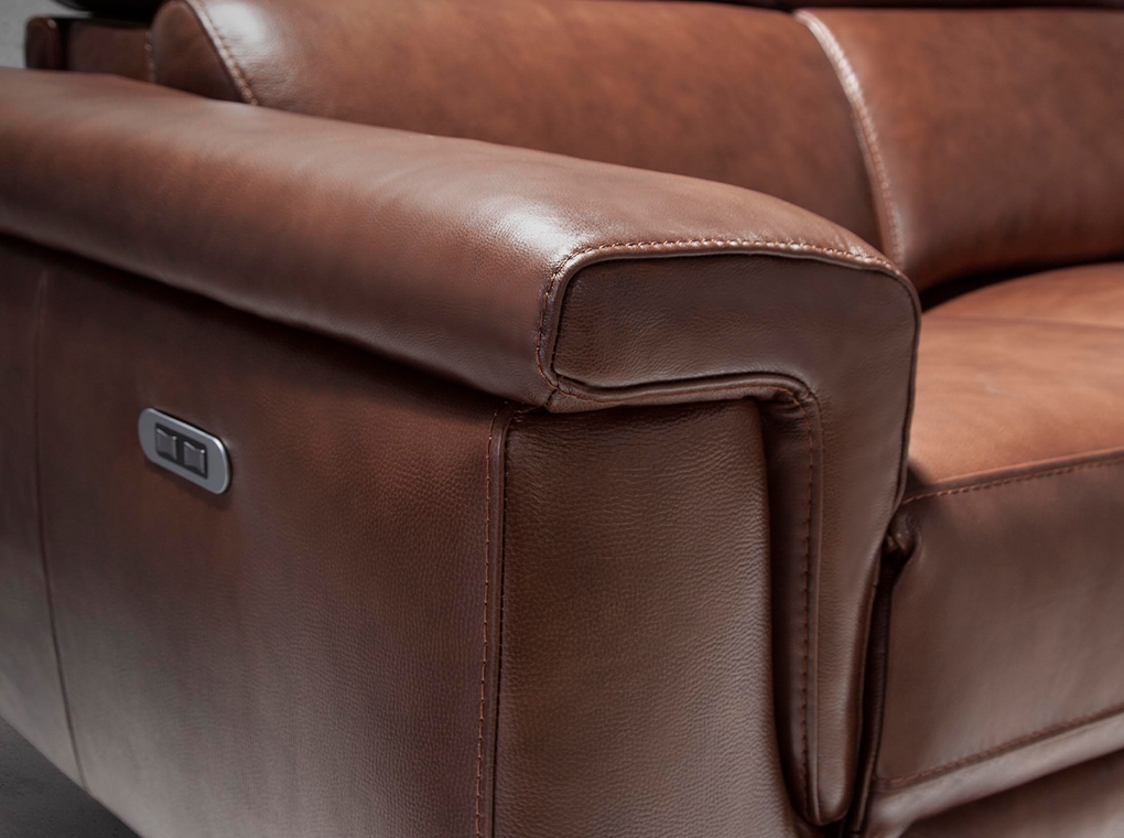2-местный диван, обитый воловьей кожей со структурой из натурального соснового дерева, с независимыми шарнирно-сочлененными подголовниками и двумя электрическими механизмами релаксации. Стальные ножки, окрашенные сплошной черной эпоксидной краской