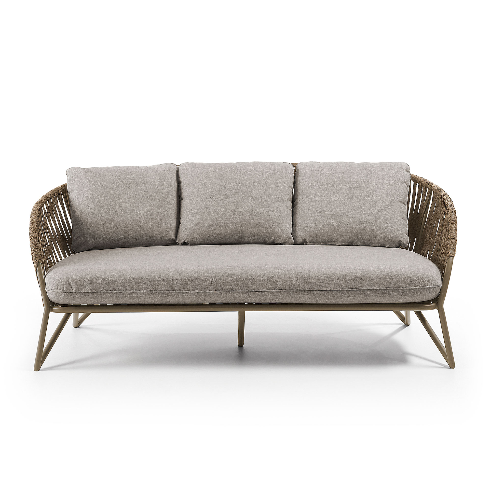 Диван имеет каркасную трубчатую конструкцию. Материал изготовления – прочный металл с порошковым покрытием для защиты от негативного воздействия влаги. Ширина трубок – 2,5 см. Верхняя часть каркаса оплетена плотной синтетической веревкой орехового цвета. Она не подвержена выгоранию на солнце, потери упругости и прочности при эксплуатации на улице.
