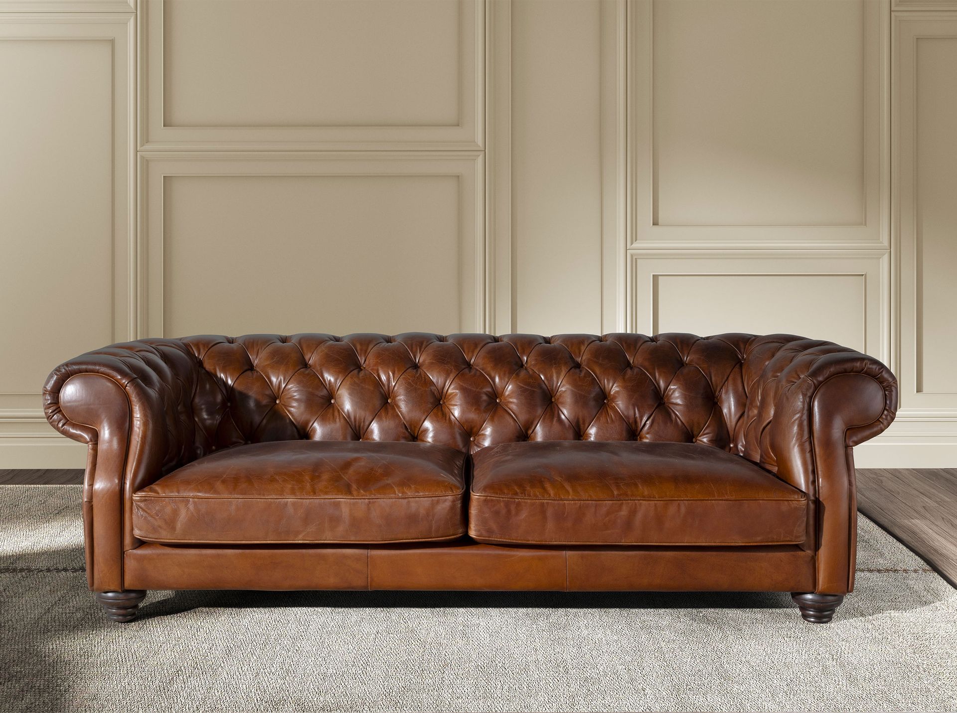 Диван Chester 3-местный с современным дизайном, обитый воловьей кожей коньячно-коричневого цвета . Благодаря своему стилю и ножкам из массива дерева, окрашенным в цвет красного дерева , этот диван привнесет нотку авангарда и элегантности, которую вы ищете в своем доме.