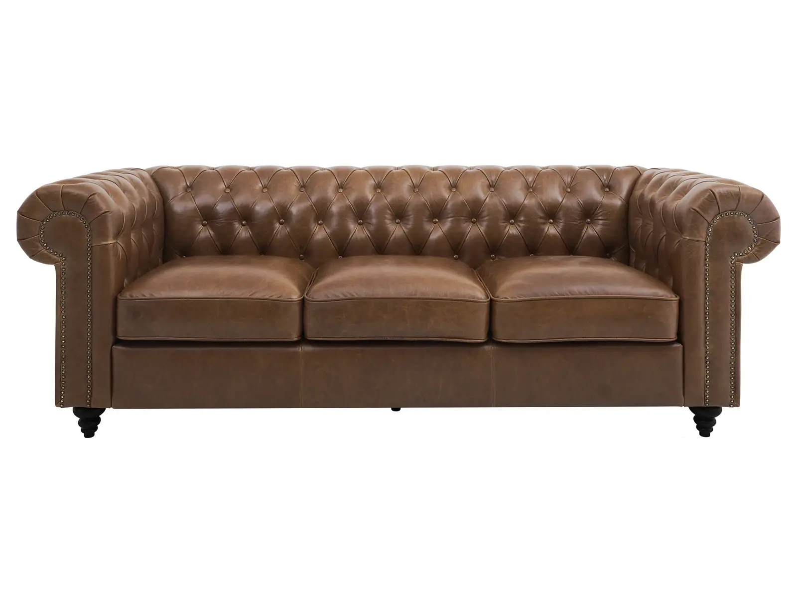 Линейка диванов «Chester Classic» представлена классическими моделями в английском стиле на ножках. Изделие может быть выполнено в натуральной коже или в другой обивке на ваш выбор. Отличительная черта диванов «Chester Classic» — спинка и подлокотники находятся на одном уровне и имеют одинаковую толщину. Благодаря наклону мягкой спинки и независимому пружинному блоку в основании сиденья, «Chester Classic» считается диваном повышенной комфортности. Подлокотники имеют форму свитков. Подобные элементы часто встречаются в архитектуре барокко. Они привносят ощущение шика и королевского стиля. Ножки дивана выполнены из дерева, имеют форму завитка, их цвет может быть коричневым или чёрным — на ваш выбор.||Представленная на фото модель — трёхместный кожаный диван. Натуральная качественная кожа, используемая для этой модели, имеет роскошную фактуру, не требует специального ухода, «дышит» - воздух и влага проходят сквозь неё, создавая циркуляцию. Долговечна, вызывает приятные тактильные ощущения, а эффект пулл-ап - кожа светлеет в местах натяжения - придаёт винтажный вид . В основании дивана - прочный каркас из бруса хвойных пород, мягкие комфортные подушки. Глубокая каретная стяжка в технике «капитоне» на спинке и подлокотниках. Которые украшены декоративными гвоздиками под состаренную бронзу, они придают изделию выразительный и аутентичный вид. «Chester Classic» - это культовый дизайн и респектабельность.
