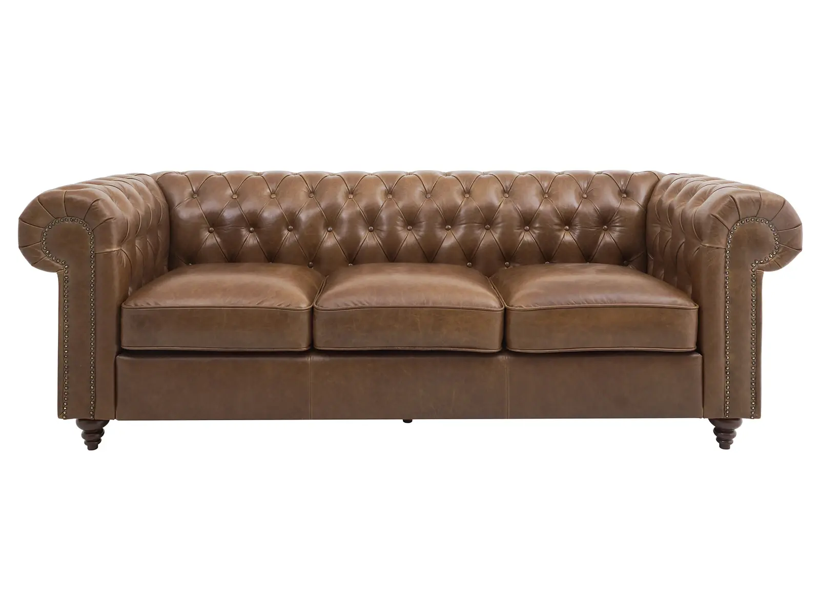 Линейка диванов «Chester Classic» представлена классическими моделями в английском стиле на ножках. Изделие может быть выполнено в натуральной коже или в другой обивке на ваш выбор. Отличительная черта диванов «Chester Classic» — спинка и подлокотники находятся на одном уровне и имеют одинаковую толщину. Благодаря наклону мягкой спинки и независимому пружинному блоку в основании сиденья, «Chester Classic» считается диваном повышенной комфортности. Подлокотники имеют форму свитков. Подобные элементы часто встречаются в архитектуре барокко. Они привносят ощущение шика и королевского стиля. Ножки дивана выполнены из дерева, имеют форму завитка, их цвет может быть коричневым или чёрным — на ваш выбор.||Представленная на фото модель — трёхместный кожаный диван. Натуральная качественная кожа, используемая для этой модели, имеет роскошную фактуру, не требует специального ухода, «дышит» - воздух и влага проходят сквозь неё, создавая циркуляцию. Долговечна, вызывает приятные тактильные ощущения, а эффект пулл-ап - кожа светлеет в местах натяжения - придаёт винтажный вид . В основании дивана - прочный каркас из бруса хвойных пород, мягкие комфортные подушки. Глубокая каретная стяжка в технике «капитоне» на спинке и подлокотниках. Которые украшены декоративными гвоздиками под состаренную бронзу, они придают изделию выразительный и аутентичный вид. «Chester Classic» - это культовый дизайн и респектабельность.