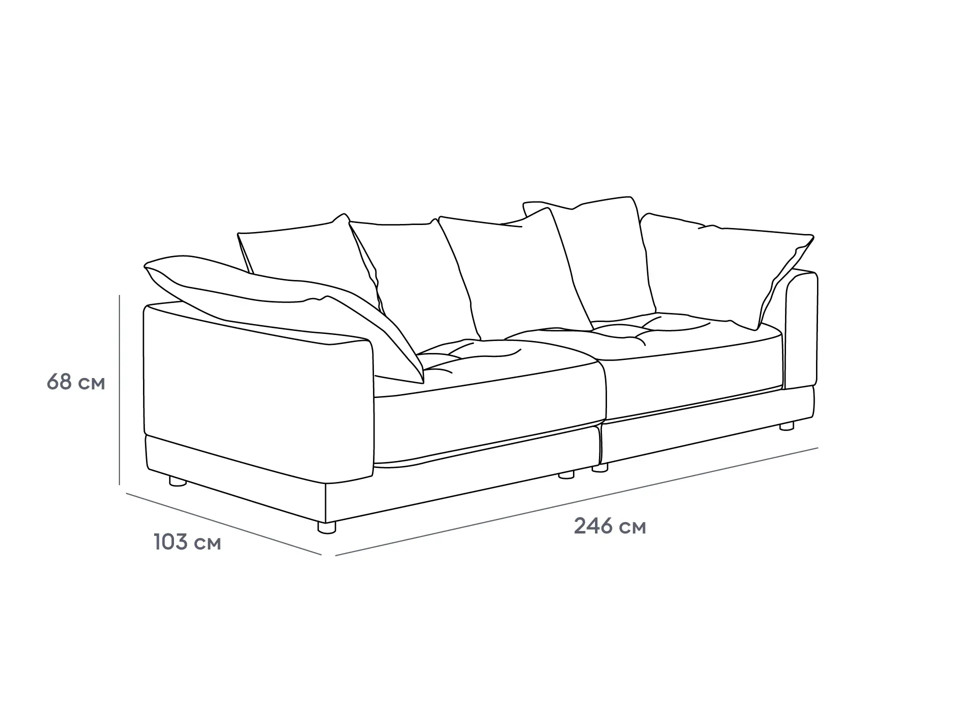 Диван дополнительно укомплектован декоративными подушками и подушками подлокотниками, наполнитель: пух-перо.
