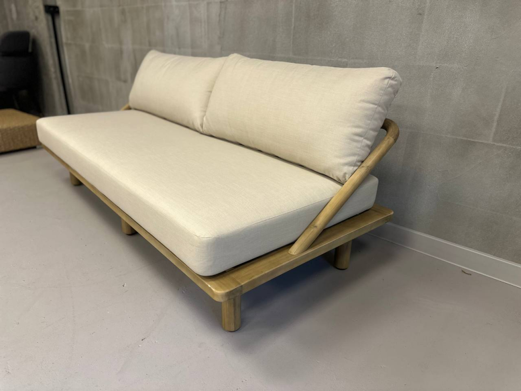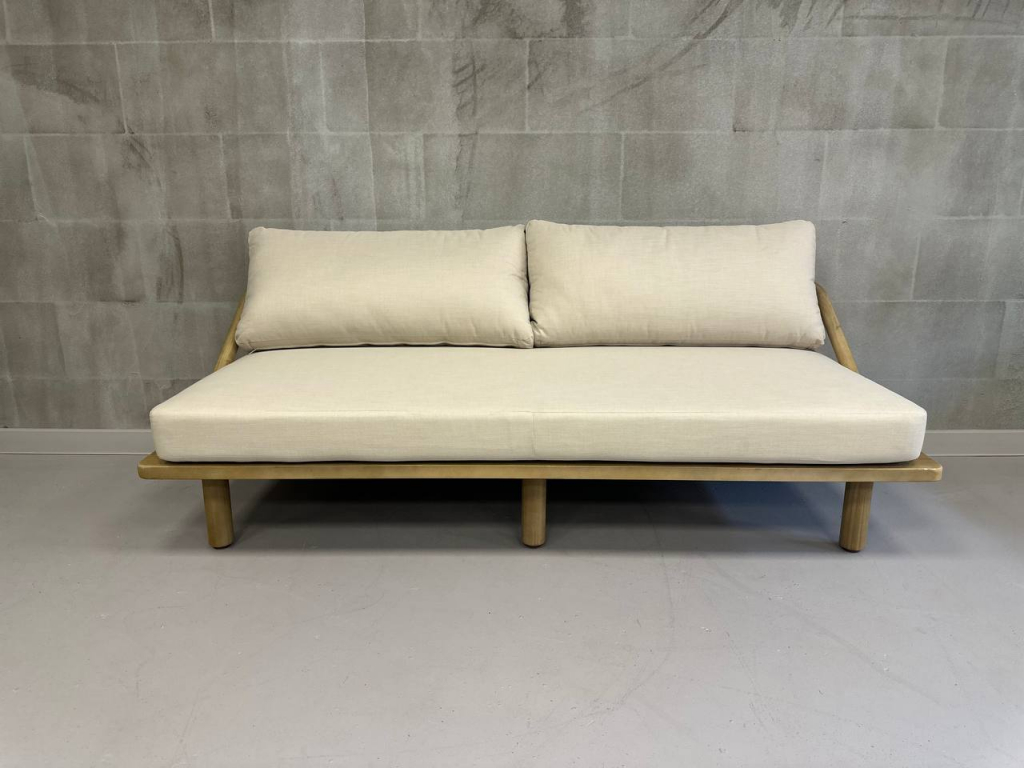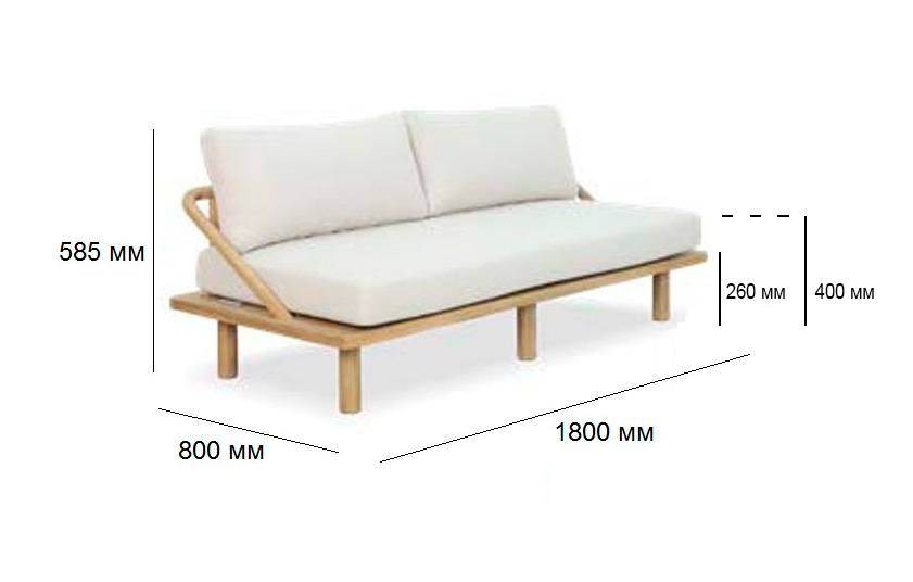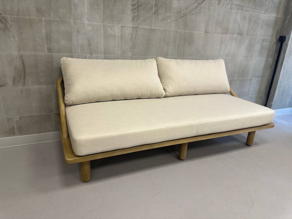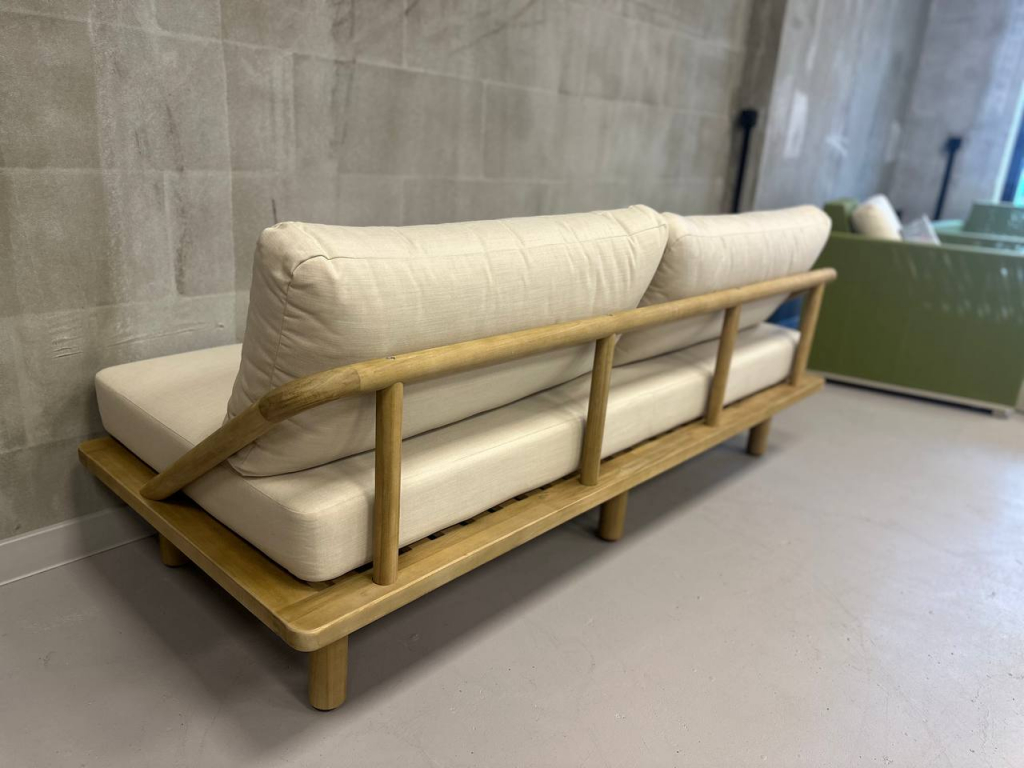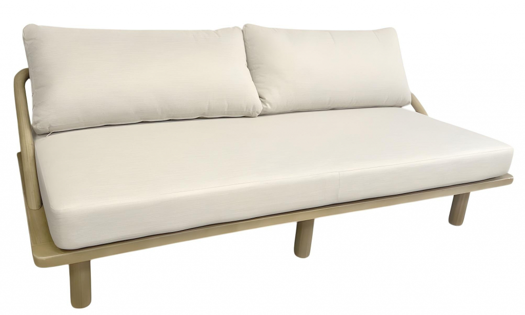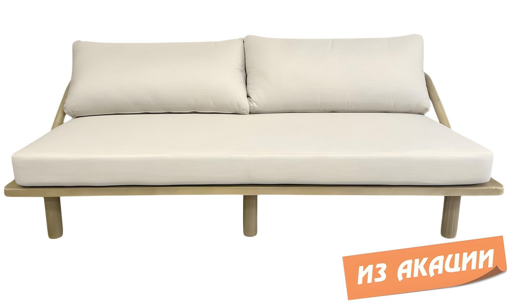 Denmark — тот самый диван, который создаёт ощущение «летнего дома», даже если это городская терраса. Каркас из акации с натуральной теплотой древесины выглядит благородно и живо, а подушки в льняном бежевом оттенке добавляют мягкости и визуального света. Лаконичный прямой силуэт и аккуратные подлокотники делают модель универсальной: она органично смотрится и в современном патио, и в более классической веранде. Посадка здесь именно для отдыха — мягкая, располагающая задержаться подольше с книгой или чашкой чая.