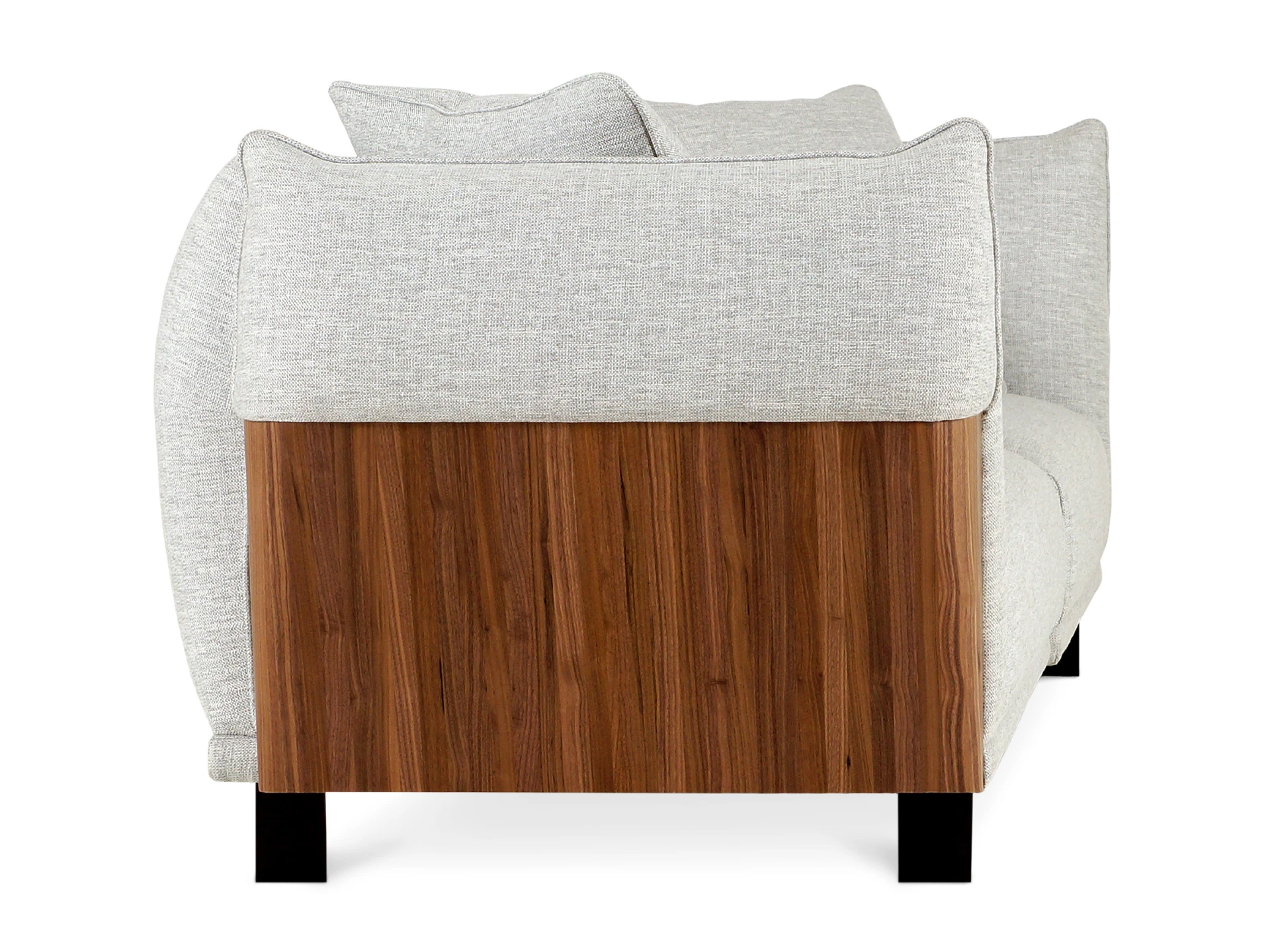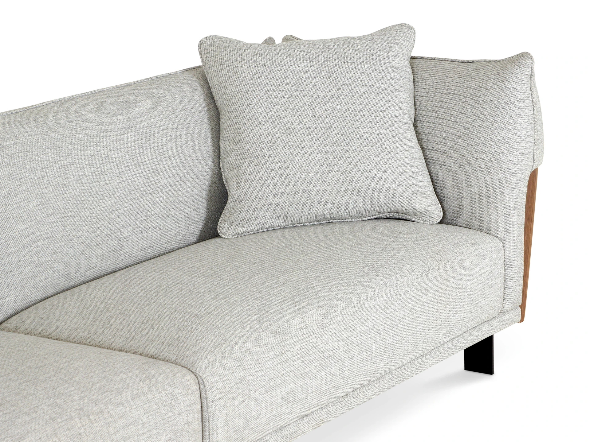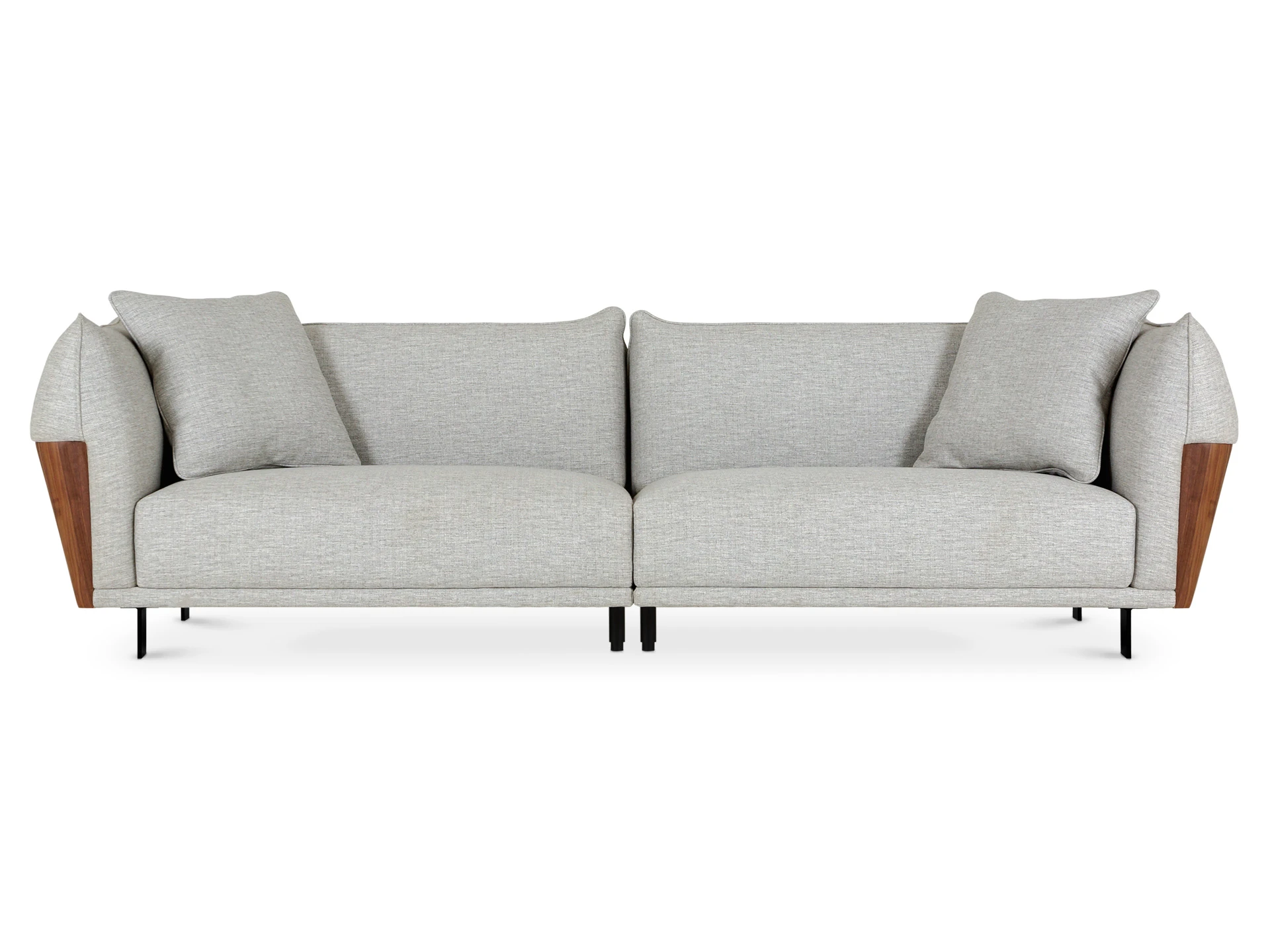 Изящный диван в минималистичном стиле с высокими подлокотниками. Смотрится легко, не перегружает пространство. Металлические ножки придают «парящее» настроение. Подлокотники находятся на одном уровне со спинкой, что создает ощущение уединённости, защиты, камерности. Выглядит компактно, но обрадует просторными и удобными подушками сиденья, спинки. Лаконичная форма позволяет использовать его для любой задачи: в составе мягкой группы в гостиной, для спальни, кабинета, кухни, офиса, бизнес-пространства. Сдержанный и практичный Dongo подойдет для обустройства стильного интерьера, который может быть как спокойным, строгим, так и динамичным, активным. Добавить индивидуальности ему можно при помощи интересного текстиля, декора, света. Диван состоит из двух секций (правой и левой), которые соединяются между собой зацепами типа «крокодил». Сидение дивана состоит из металлических пружин тип «змейка», войлока, настила из нескольких слоев пенополиуретана, холлофайбера. Спинка: резинотканевые ремни, настил из нескольких слоев пенополиуретана, холлофайбер. Наполнение декоративных подушек – синтепух в чехле из спанбонда. Боковые накладки подлокотников – плита МДФ облицованная натуральным шпоном ореха и покрытая прозрачным лаком. Материал обивки - рогожка 3 категории. Лицевой чехол дивана - несъемный. Лицевой чехол декоративных подушек – съемный. В основании дивана – четыре металлические Т-образные опоры матового черного цвета по углам, и четыре цилиндрические регулируемые опоры по центру. На торцы опор установлены пластиковые подпятники.