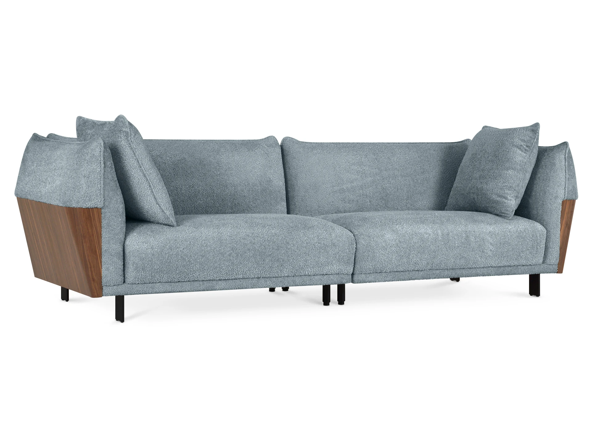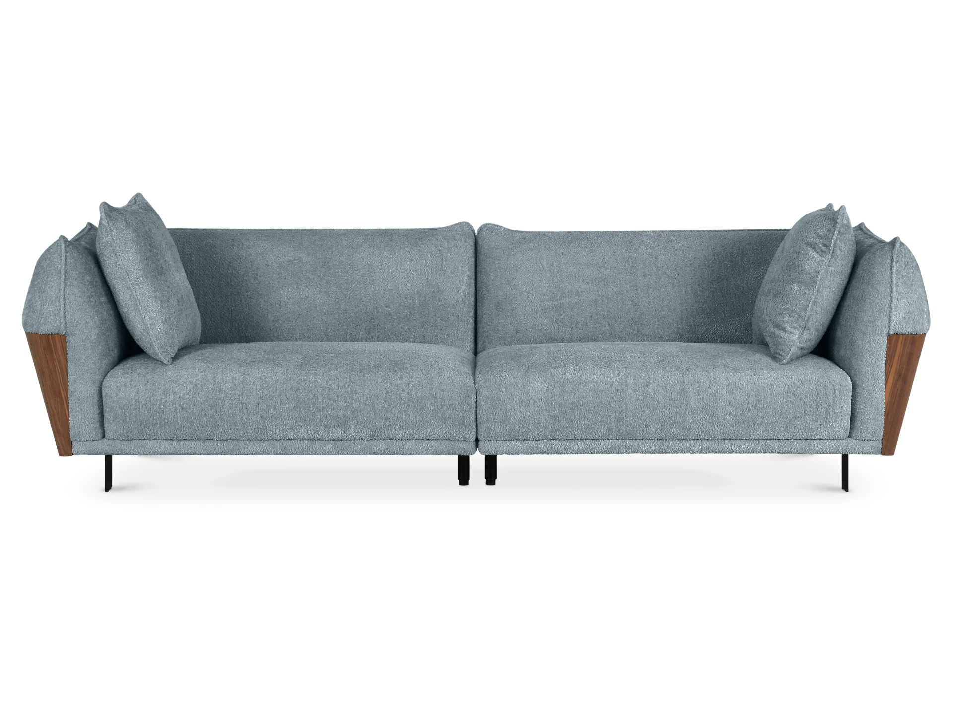 В основании дивана – четыре металлические Т-образные опоры матового черного цвета по углам, и четыре цилиндрические регулируемые опоры по центру. На торцы опор установлены пластиковые подпятники.