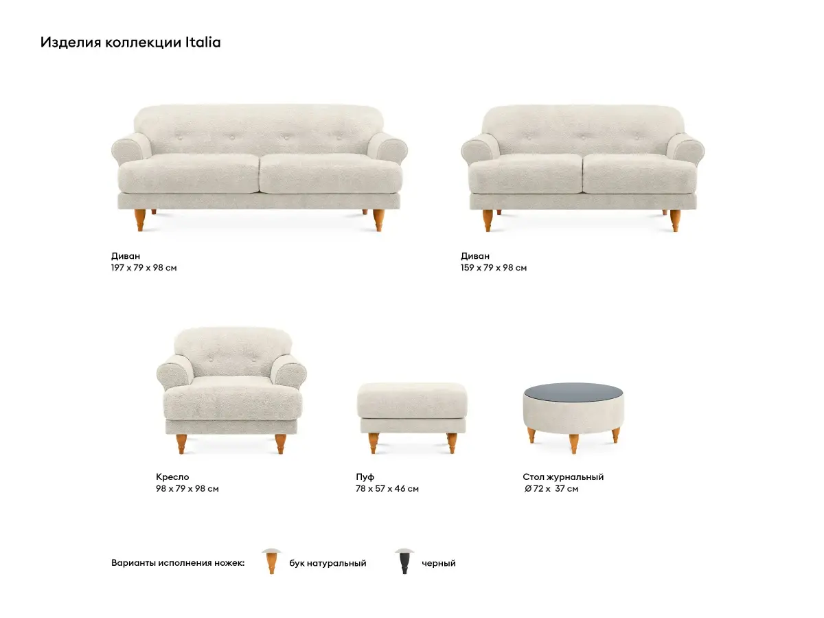 Двухместный диван Italia на деревянных ножках - модель классического европейского дизайна. Прямоугольное сиденье, образованное двумя подушками, обеспечивает комфортную посадку. Спинка с закругленными краями делает изделие гармоничным и плавным. Деревянные круглые ножки с фигурной обработкой создают ощущение невесомости и легкости, диван словно «парит» в пространстве. Невысокие подлокотники закруглены наружу, изюминку их формы по достоинству можно оценить при отдыхе лежа. Спинка украшена пуговицами стяжек – черта стилистики ретро.|Сочетание в каркасе деревянного бруса еловых пород с МДФ обеспечивает прочность и основательность. В меру мягкие, эластичные и износоустойчивые наполнители спинки и подушек сиденья – пенополиуретан и синтепон отвечают за качество вашего отдыха в любом положении. Широкий выбор материала обивки по цвету и фактуре. Italia – лаконичный диван с особенной эстетикой. Недаром он носит название страны, которая ассоциируется с искусством, культурой и утонченностью. В зависимости от стиля интерьера и декора диван Italia может выглядеть романтично, строго или изысканно.