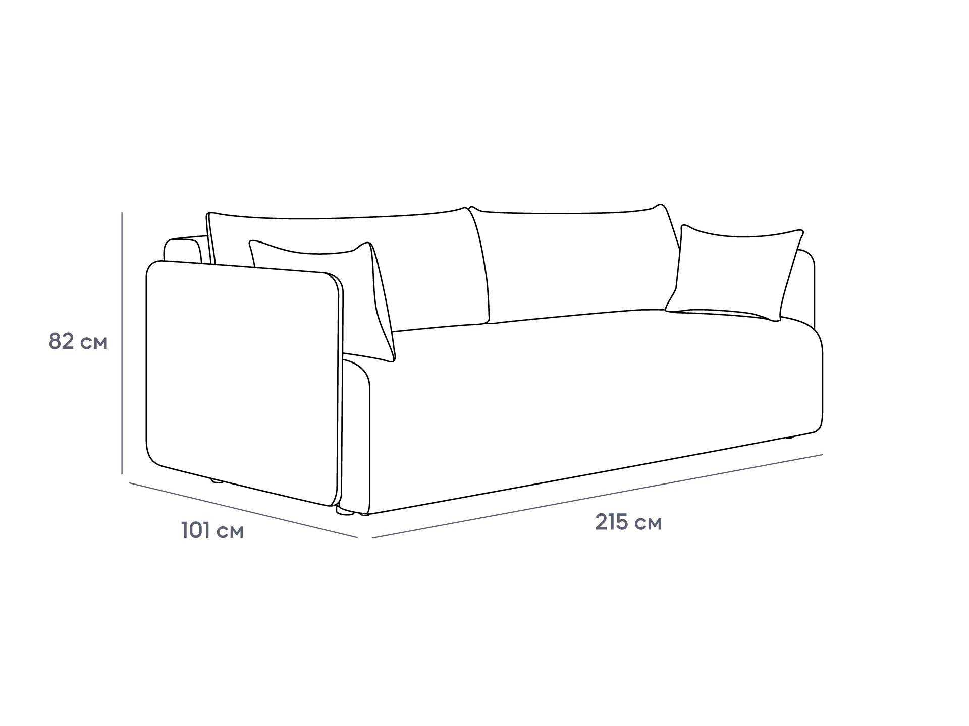 Диван комплектуется двумя парами декоративных подушек: 1020х410х220 мм.- 2 шт., 500х330х160 мм. - 2шт. Облицовочные чехлы декоративных подушек- съемные на молнии, внутренние чехлы - не съемные.