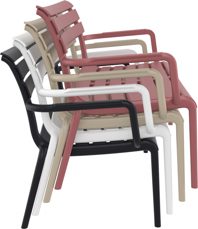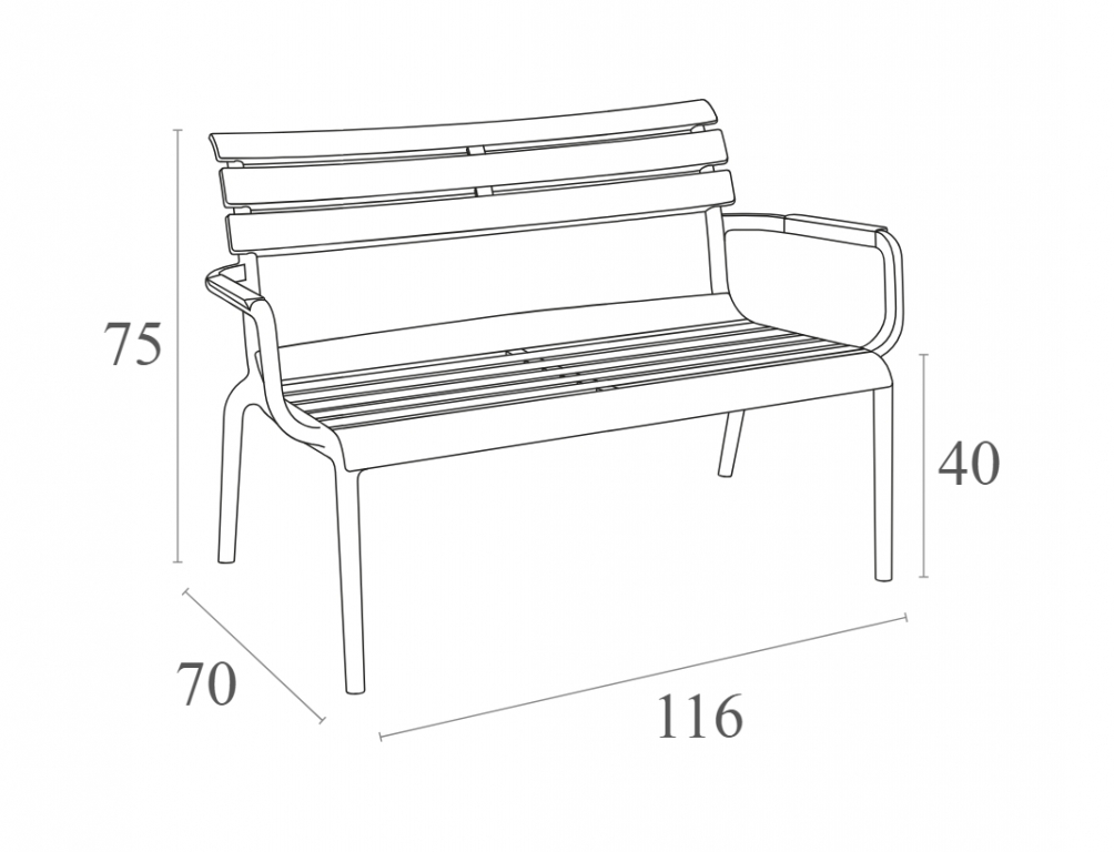 Ширина 116 см и глубина 70 см — оптимальный формат «на двоих»: можно сидеть свободно, не занимая половину площадки. Вес 11 кг позволяет легко менять расстановку вслед за солнцем, а возможность штабелирования помогает хранить диваны компактно, если вы собираете мебель на сезон. Paris Lounge — простой способ оформить уличную зону в стиле курортного минимализма.