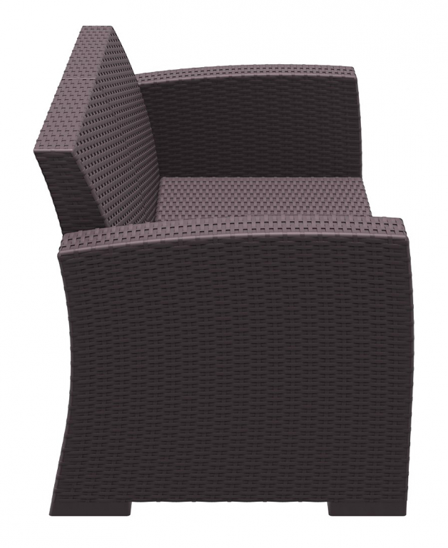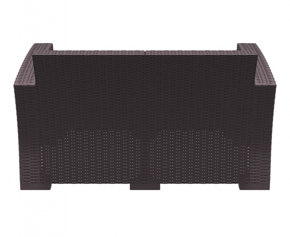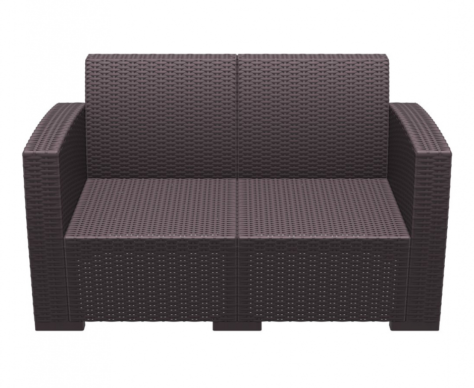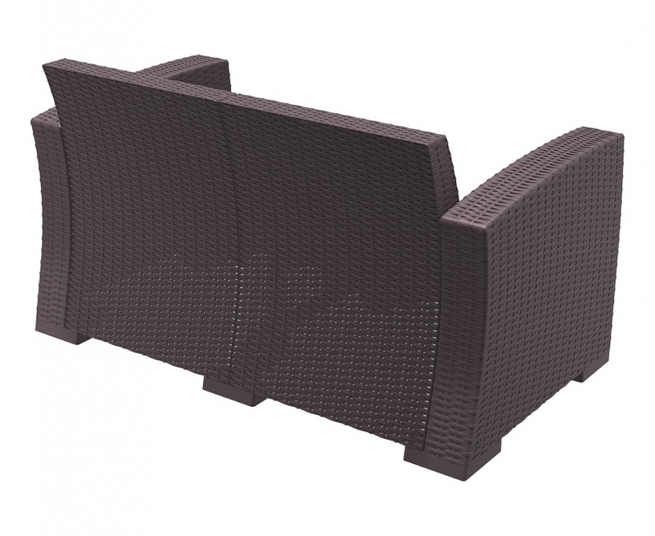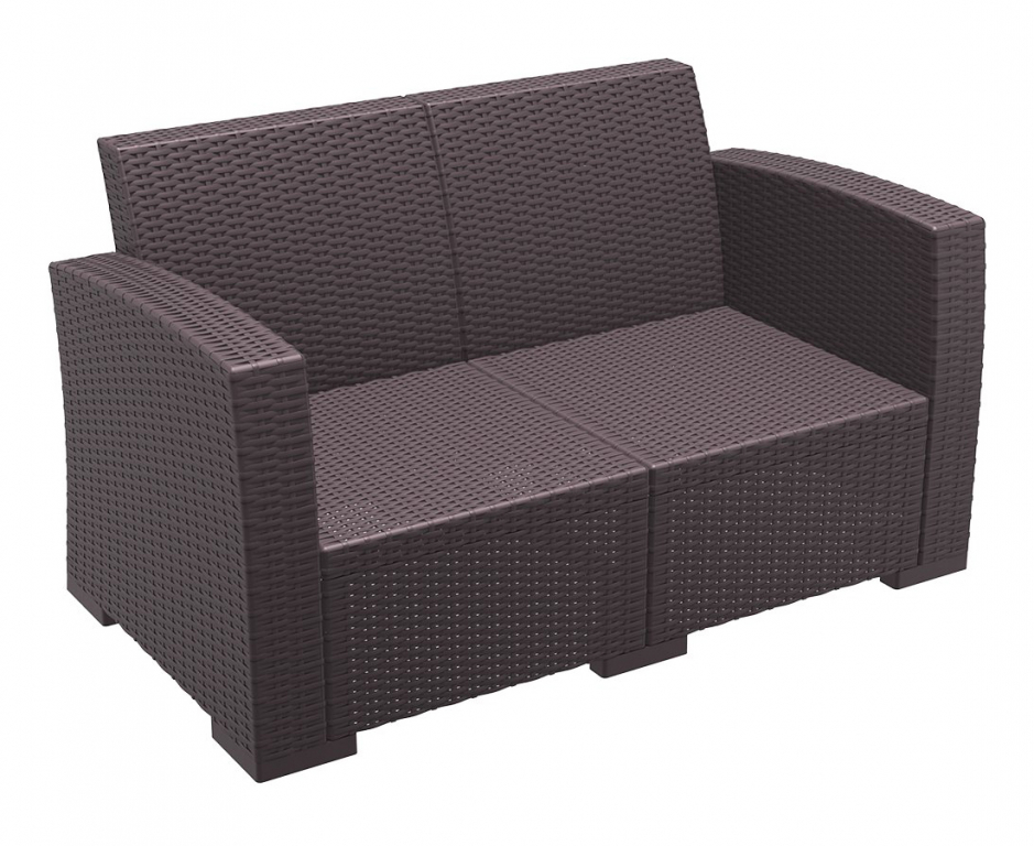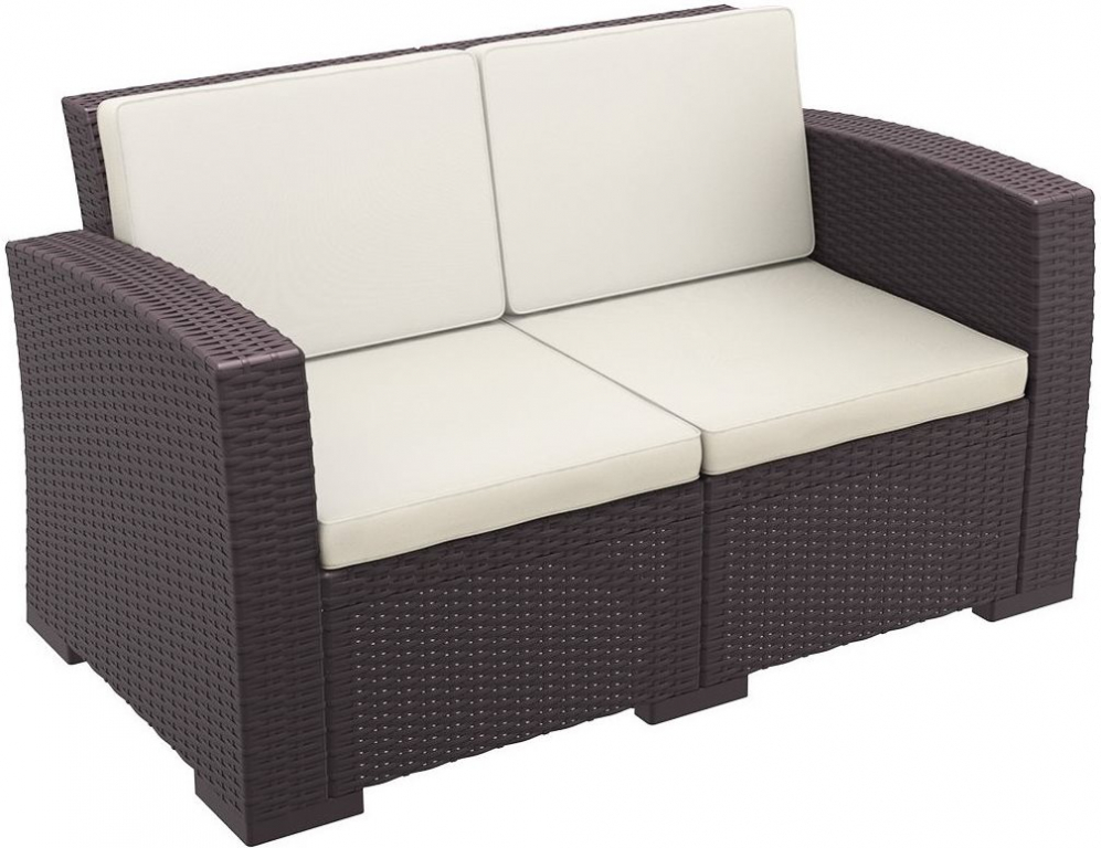 Диван пластиковый плетеный двухместный с подушками Monaco Lounge — простой способ добавить на террасу или к бассейну ощущение курорта. Коричневый оттенок и имитация плетения смотрятся тепло и «натурально», при этом силуэт остаётся современным и лёгким. Основа из пластика с армированием стеклопластиком и деталями из полиэстера рассчитана на улицу: материалы переносят смену погоды и не требуют сложного ухода — достаточно протереть поверхность.