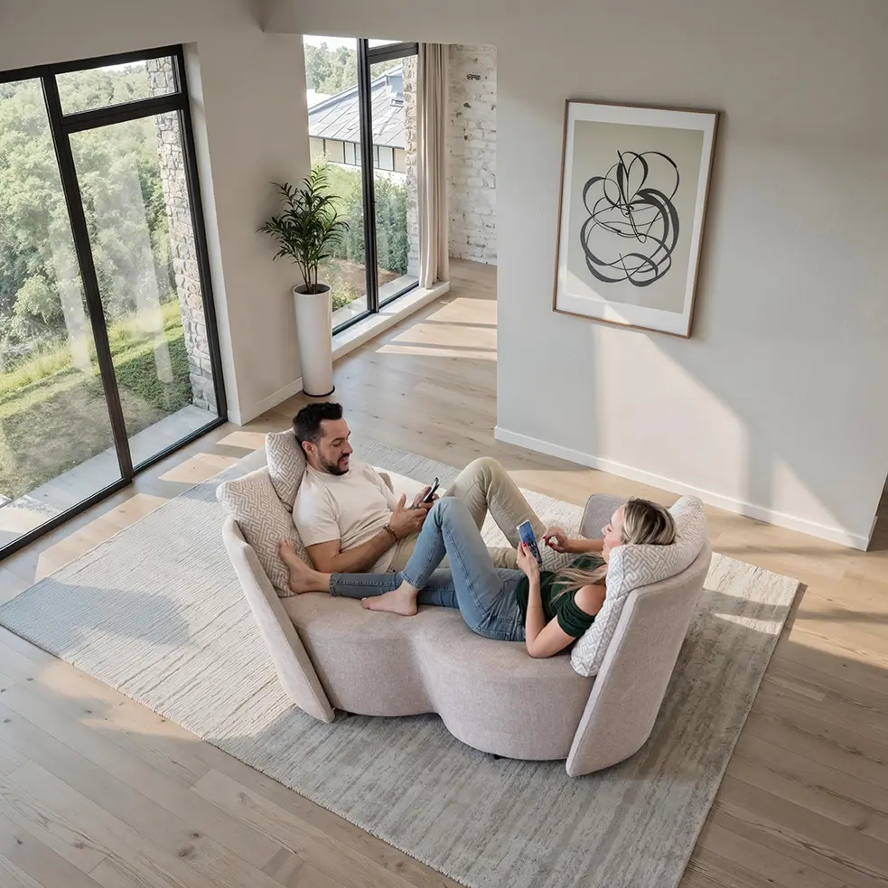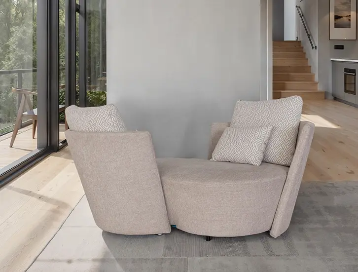 Диван Infinity от Fama — это не просто диван: это революционное изделие, созданное в ответ на новые стандарты совместного проживания дома. На первый взгляд он может показаться обычным диваном, но вращающееся сиденье легко превращает его в современный диван в стиле «Ты и я» — уникальная концепция, способствующая укреплению связи и близости без ущерба для индивидуального комфорта.