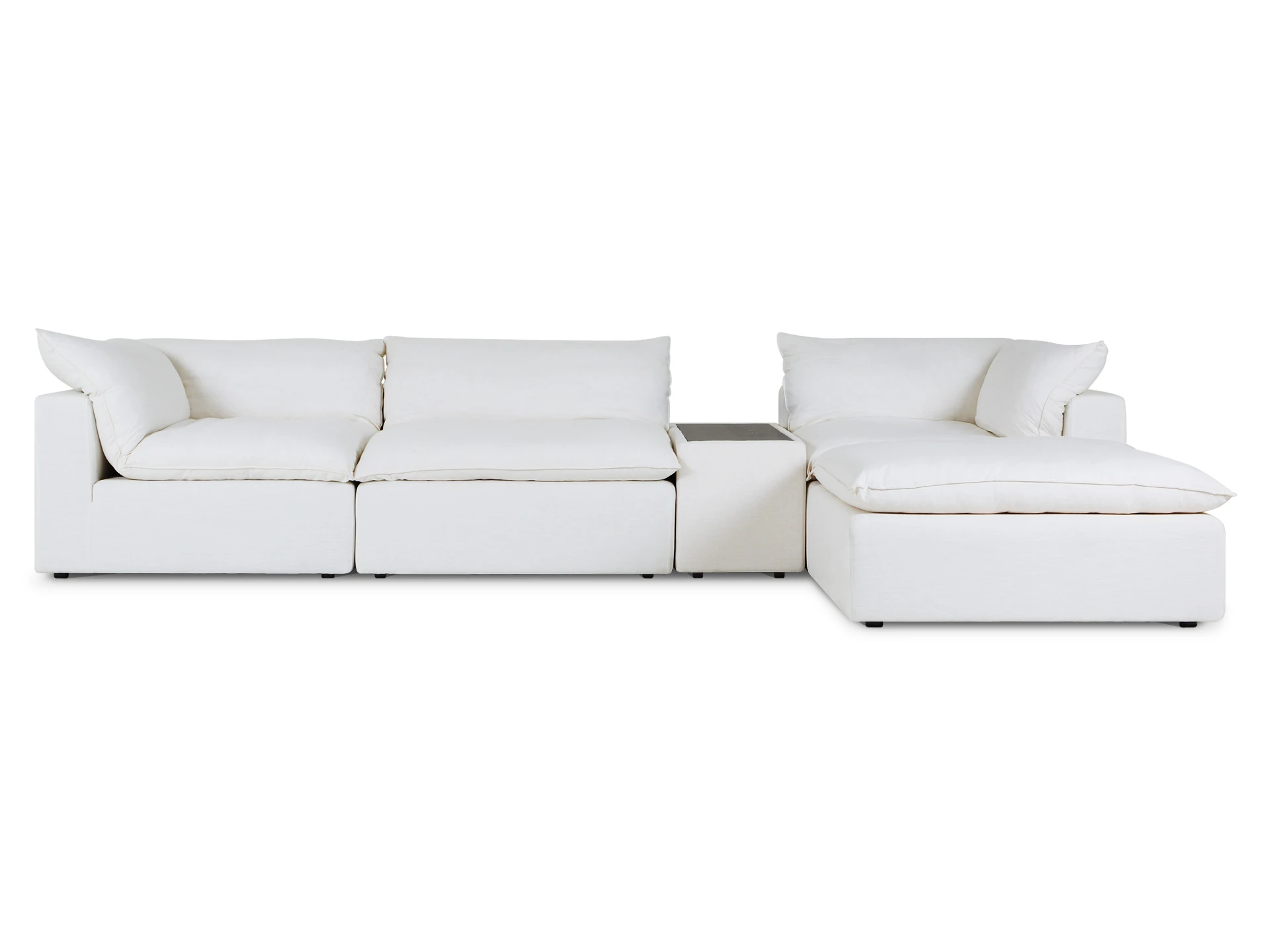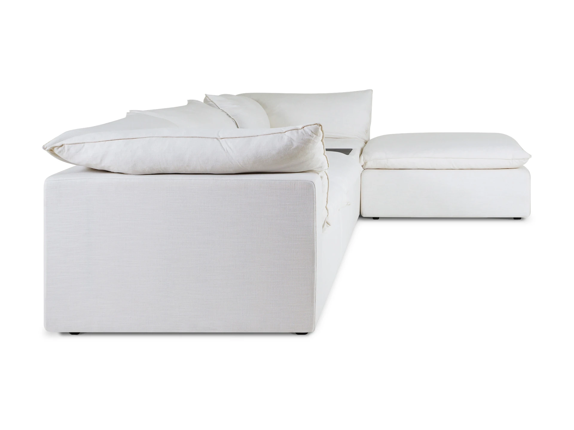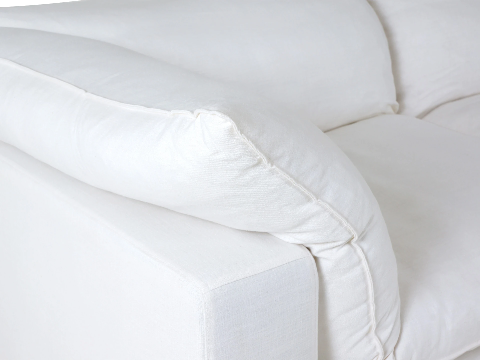 Материал обивки - рогожка (80% вискоза, 20% лен) в 8 категории отличающаяся повышенной прочностью, продолжительной эксплуатацией и износостойкостью. Материал ножек - пластик. Наполнитель подушек - пух/перо. Лицевой чехол подушек - съемный, на молнии. Столешница приставного столика из МДФ со шпоном.