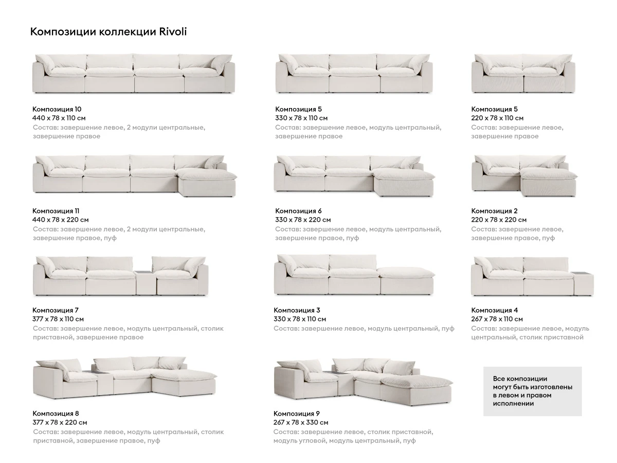Можно организовать привлекательное место для отдыха большой компанией в просторной гостиной или камерную локацию на компактной площади. Диван Rivoli — не только превосходный уровень комфорта и эстетики вашего интерьера, но и ваша ежедневная тактильная радость!