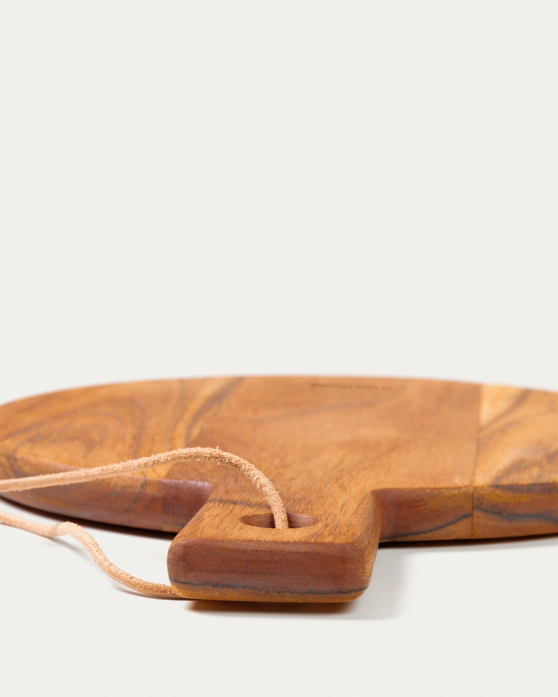 Разделочная доска Salina, круглая по форме, полностью изготовлена из древесины акации. Будучи цельным материалом, каждая часть имеет свои уникальные и неповторимые полосы и оттенки, что делает каждую доску уникальной. Для этого натурального дерева мы рекомендуем не помещать его в посудомоечную машину и мыть вручную. Длительное воздействие воды (особенно горячей) может негативно сказаться на кухонной утвари из дерева. Вода смывает защитный, масляный слой этих природных материалов, что чревато появлению на них мелких трещин, началу гниения и разрушения их состава. Все эти предметы лучше держать подальше от посудомоечной машины. И, поскольку мы думаем обо всем, мы добавили в ручку шнур из натуральной кожи, чтобы повесить его.
