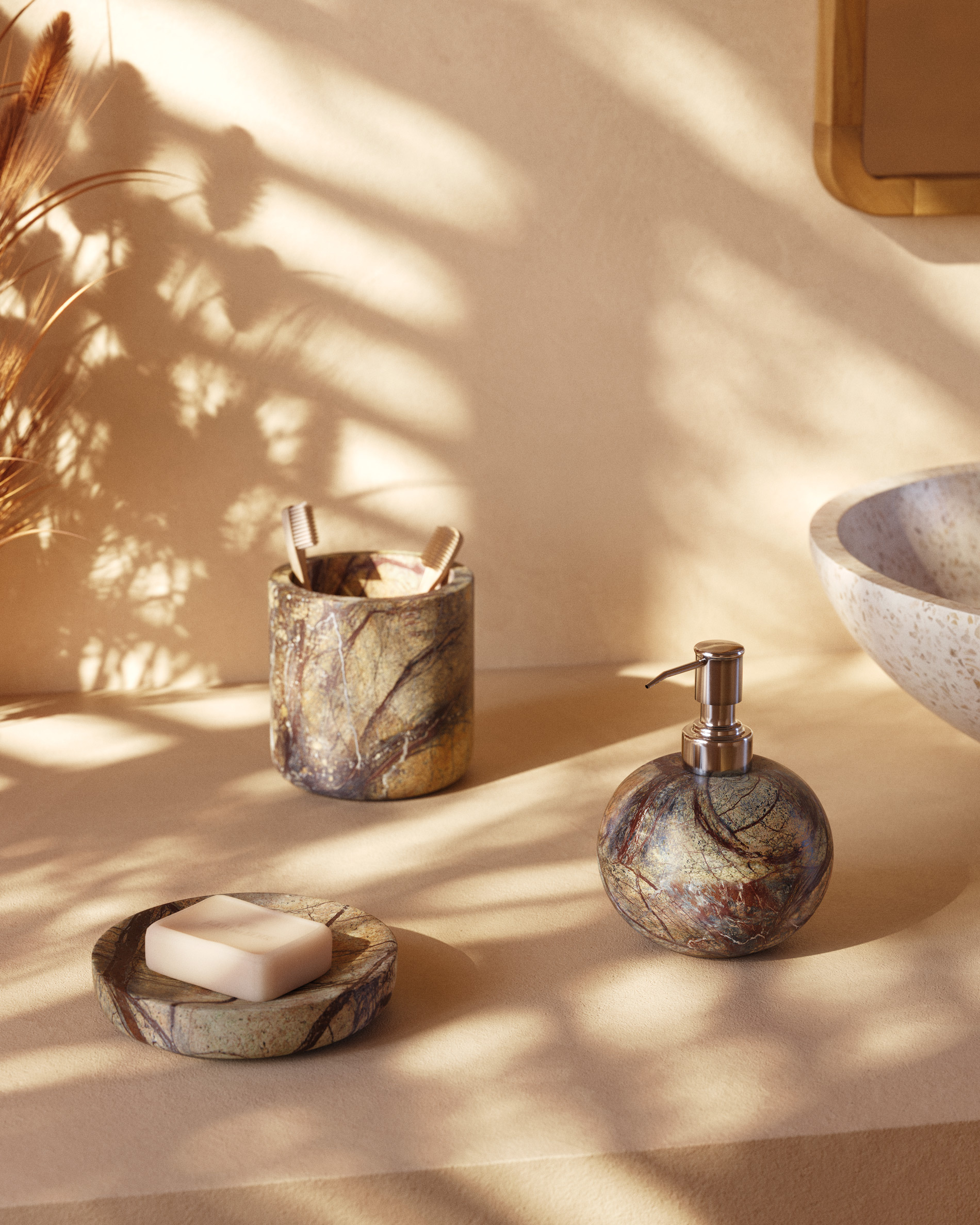 Дозатор для жидкого мыла Spalsh от фабрики La Forma (ex Julia Grup) – абсолютно эксклюзивный из бежевого мрамора.