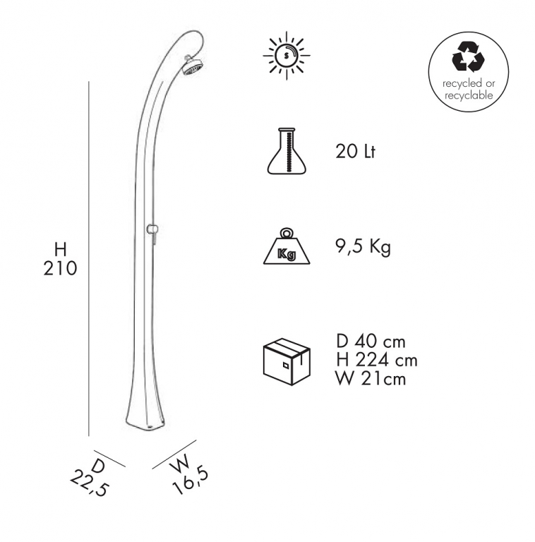 Высота 210 см делает использование комфортным, а компактное основание 16,5×22,5 см экономит место. Вес 9,5 кг добавляет устойчивости, сохраняя ощущение лёгкости и аккуратности. Happy One F 100 отлично подходит для быстрых летних ритуалов — смыть хлор после бассейна, освежиться перед ужином или просто подарить себе минуту прохлады в жаркий день.