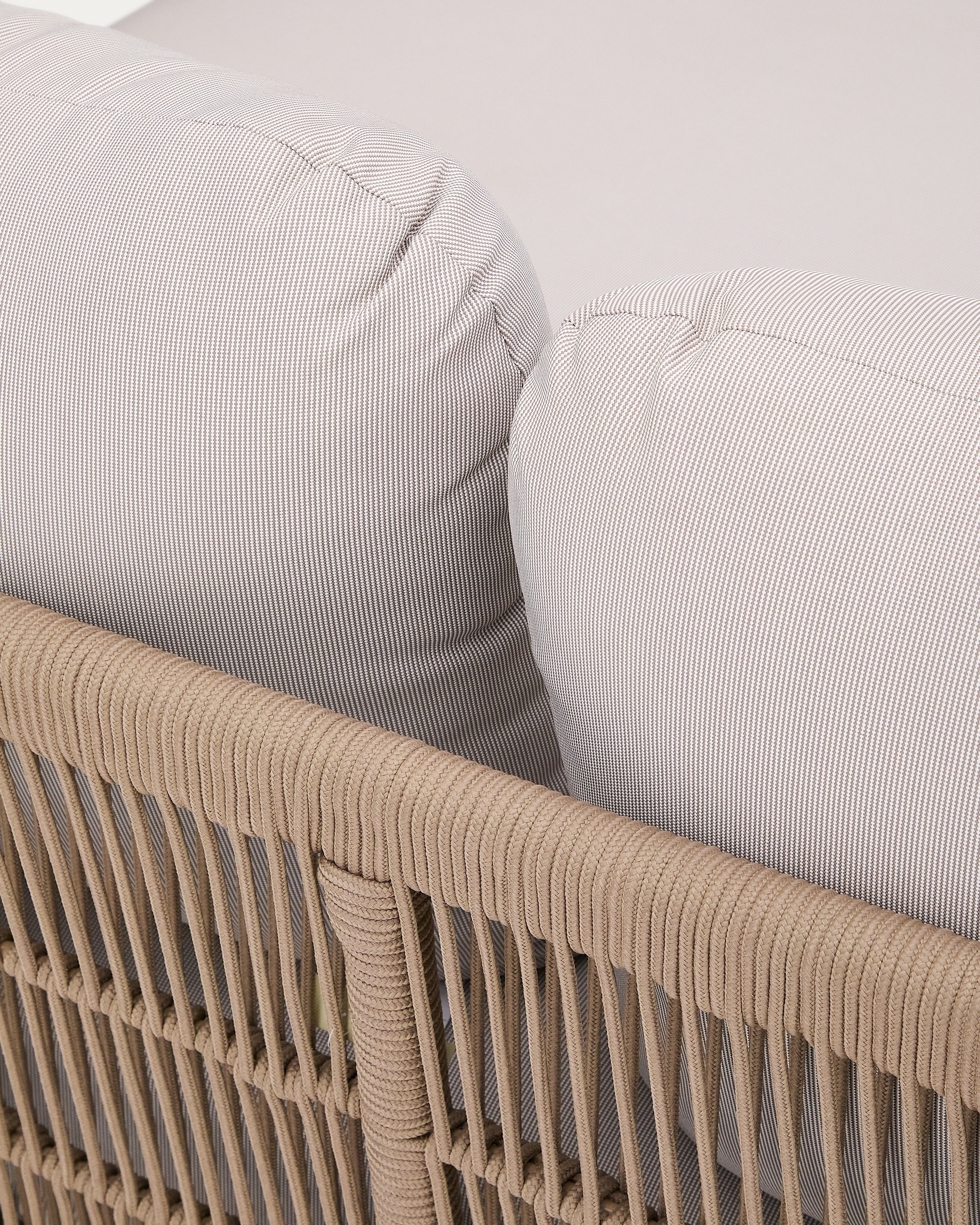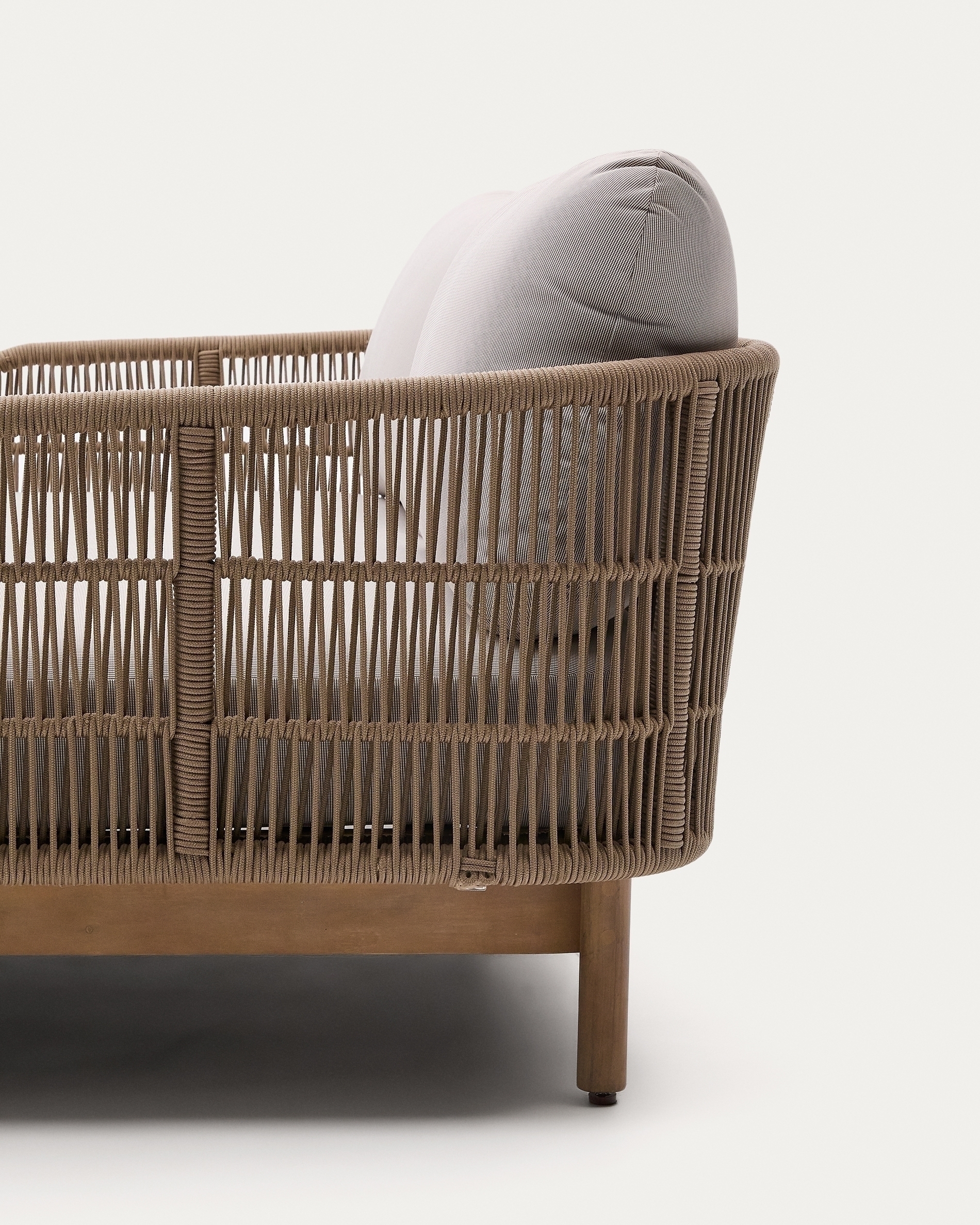 Его устойчивость к ультрафиолетовому излучению гарантирует, что красота его материалов останется нетронутой даже в помещениях, подверженных воздействию солнца, а съемные подушки делают его столь же практичным, сколь и удобным, что облегчает его чистку и уход. Чтобы поддерживать его в идеальном состоянии, мы рекомендуем наносить специальные средства для дерева не реже одного раза в год. Кроме того, его металлическая конструкция с полиэфирным порошковым покрытием обеспечивает оптимальную устойчивость и долговечность.