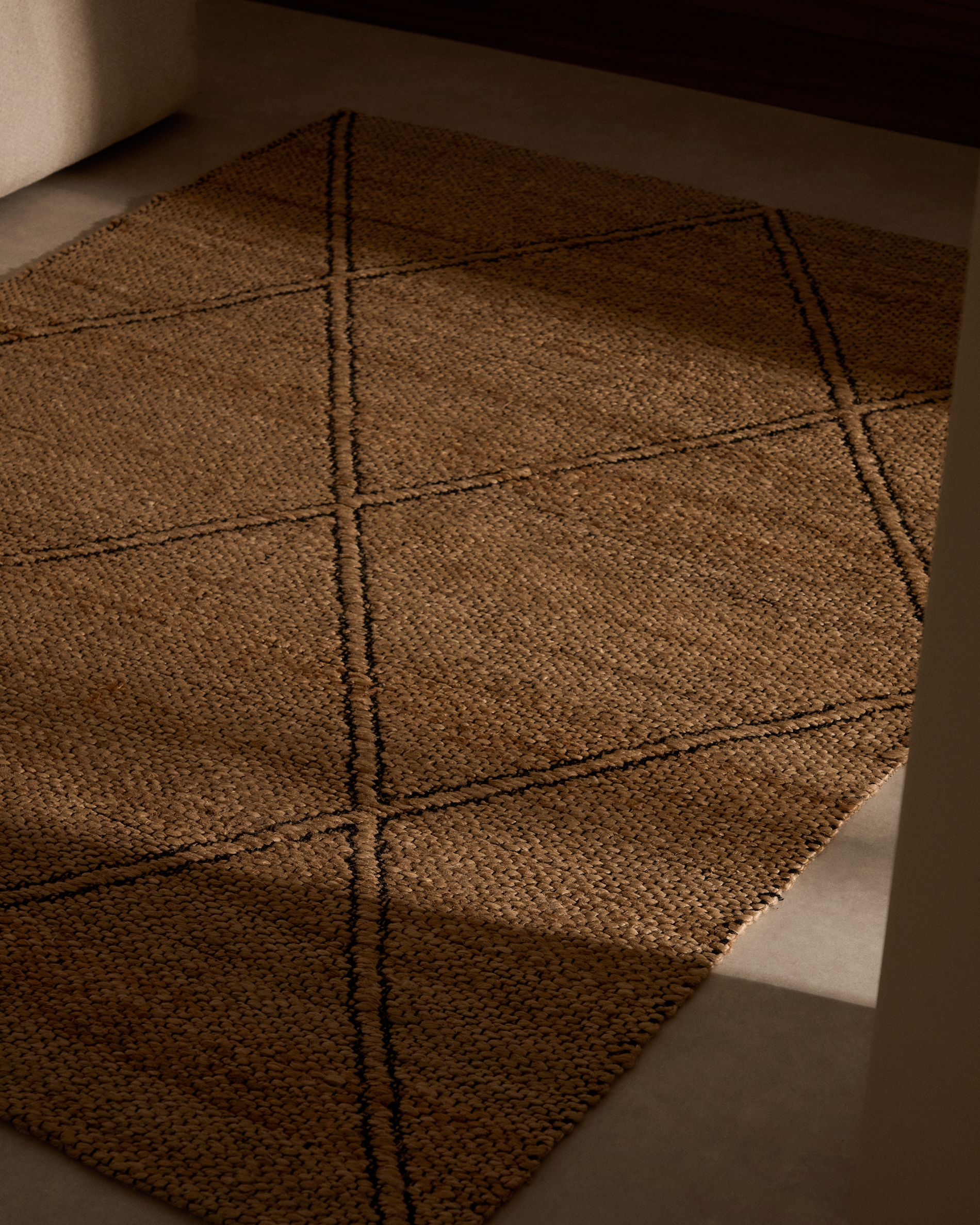 Ковер имеет прямоугольную форму. Он сплетен вручную из натурального джута, поэтому каждое изделие обладает своим уникальным цветом и нюансами фактуры.